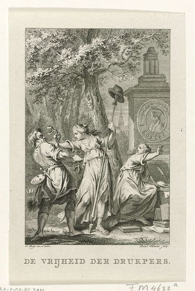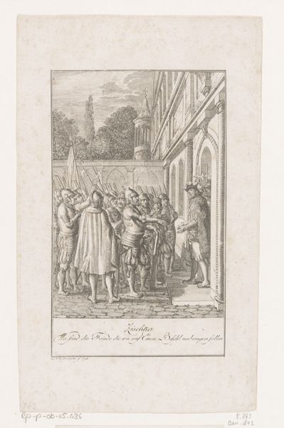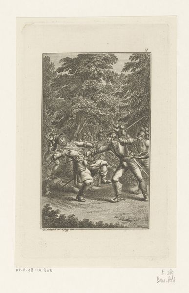 "Miss West wordt ontvoerd" was etched by Daniel Chodowiecki, likely in the late 18th century. The printmaking technique of etching involves coating a metal plate with a waxy ground, scratching an image into it with a needle, and then bathing the plate in acid, which bites away the exposed lines. Chodowiecki skillfully uses the etching process to create a detailed scene. The fineness of the lines allows for intricate depictions of the figures' clothing, facial expressions, and the surrounding landscape. Etching, unlike painting or sculpture, is a reproductive medium; multiples can be printed, spreading the image and the ideas it contains. Considered within a broader historical context, the print reflects the growing accessibility of art to a wider public, facilitated by the mechanization and spread of printmaking. By focusing on the material and process of this etching, we gain a deeper understanding of its cultural significance, and the democratization of image-making in the 18th century.