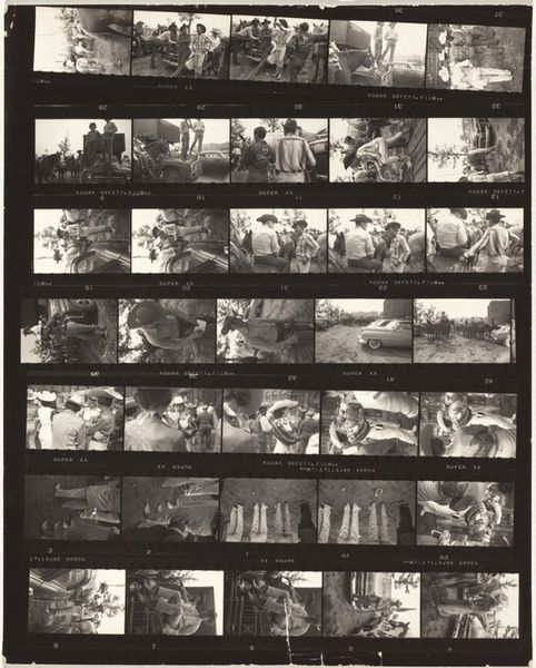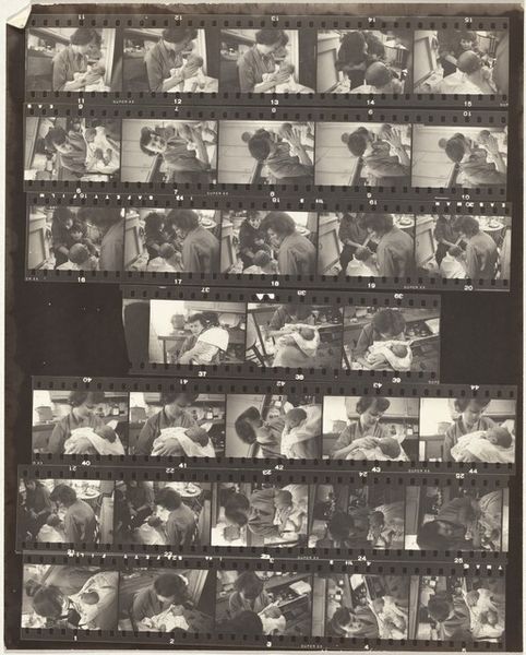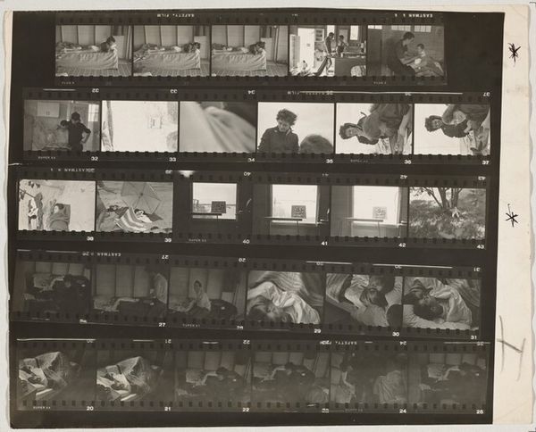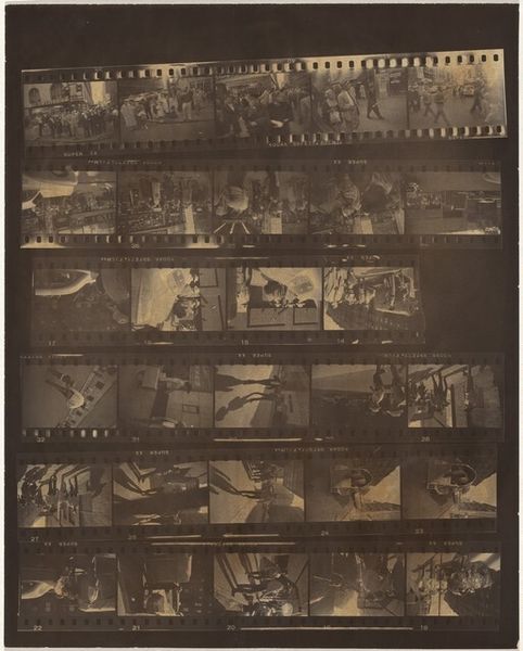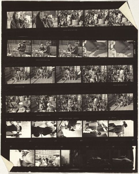 Curator: Robert Frank's "Whitney 1," taken in 1958, presents us with a gelatin silver print capturing scenes within what I assume is the Whitney Museum, offering a fascinating glimpse into the art world of the late 50s. Editor: My first impression? This reminds me of flipping through old family photos, that feeling of stumbling upon lost moments, grainy and full of whispers. It's a bit voyeuristic, isn't it? Curator: Indeed. Frank's work often possesses that fly-on-the-wall quality, and that raw energy for which he is now very well known. But here it strikes me as less about him and more about this social tableau, this presentation of cultural capital. Consider how the work almost dares us to examine the culture and status within these frames of the wealthy art viewers themselves. Editor: I agree, though what really captures me is how these individual frames—like snippets of memories—when put together, give the effect of fractured scenes—they offer so much but remain mostly unknowable, somehow like fleeting impressions in time. It has that beautifully restless energy—I like the pace and movement between these discrete snapshots. Curator: I appreciate how you've zoomed in on that fragmented perspective. Zooming out to the sociopolitical element of the photo itself is quite important to Frank's own context and process, I think. What we're getting at here is his perspective on high-art world from someone who remained very separate, both economically and often ideologically. And Frank seemed committed to holding this perspective together despite external pressure, Editor: Yeah, totally! There's something wonderfully anarchic about it—not destructive, but defiantly resisting easy classification and comfortable viewpoints. Maybe it's the grain, or the blur, but it feels like a rebellion against perfect polish. You can tell Frank's just holding the camera up to something he finds important in each scene! Curator: Agreed. "Whitney 1," at its core, is perhaps more interested in the people observing art than the art itself—a poignant commentary on the evolving dynamic between art, viewer, and society during a transformative era. Editor: Totally! And this messy reel feels so wonderfully, ironically human. The highbrow setting contrasting the accessible capture; it’s brilliant, right?