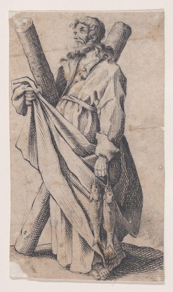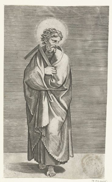 Marco Dente created this engraving of Saint Paul holding a sword and a book in the 16th century. The composition presents a full-length figure against a stark, linear background, immediately drawing our attention to the textures and details meticulously rendered by the artist. Dente's use of line is particularly striking. Notice how dense, parallel lines create a sense of shadow and volume, especially in the drapery and the saint’s beard, giving the image a tangible depth. The sword and book are not merely symbolic attributes; they are rendered with equal attention to texture, highlighting their physical presence. This approach aligns with the Renaissance interest in humanism and the tangible world. The even light emphasizes form, but also invites a symbolic reading: the sword, often interpreted as martyrdom or strength through faith, and the book, representing the Gospel, become pivotal signs within this visual language. Dente balances these elements, making the artwork a compelling example of how form and content intersect within the religious and artistic conventions of his time.