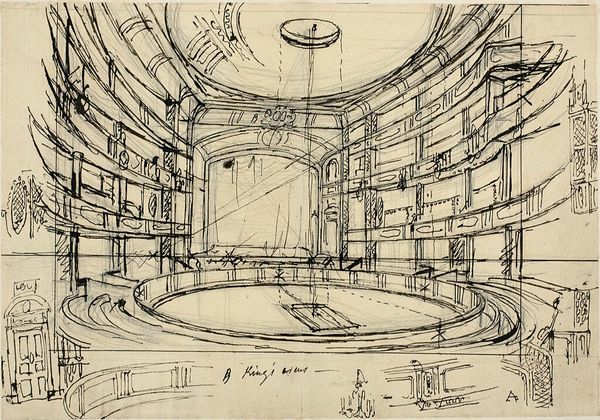 Curator: Allow me to introduce "Study for Royal Circus, from Microcosm of London," a drawing by Augustus Charles Pugin, dating from around 1809. It's executed with graphite and etching on paper. Editor: The initial impression is a skeletal elegance—lines articulating space more than defining it. It feels almost like a ghostly blueprint of entertainment. Curator: Precisely. Observe how Pugin uses delicate lines and perspective to delineate the architectural framework. The scaffolding, if you will, for a vibrant social space. It reveals an interest in pure form. The etching enhances those fine lines and gradations. Editor: Yet, it’s not just about pure form, is it? This is a study for the Microcosm of London. The Royal Circus, a popular venue, accessible to various classes. I see a portrait of leisure during a turbulent time in England, caught between revolution abroad and the tightening grip of industrial change. Curator: An interesting consideration. Though, I am more drawn to Pugin's treatment of depth and volume. How he masters the illusion of a receding space within the constraints of a two-dimensional plane. Note, for instance, the oculus overhead, carefully planned sightlines, with structural considerations. Editor: Still, that consideration removes the study from its context, reducing it to pure design, an interesting rendering, perhaps. The real power emerges if one views the Royal Circus, even in skeletal form, as a site of social interaction. Who occupied those boxes? Who filled the pit? These structures aren’t neutral. They reflect power relations and hierarchies in Regency England. Curator: Yes, a crucial point, that does alter our perspective, somewhat, from design to setting the stage for social history. Though one has to respect the careful compositional strategies that structure meaning. Editor: And considering how context can reshape those meanings! This interplay highlights art's fascinating duality—it is both self-contained form and mirror to a world in flux.