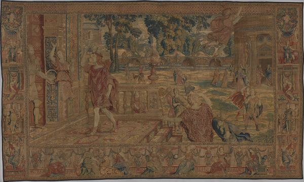 Curator: This textile hanging is "Adoration of the Kings," likely woven between 1525 and 1535 after a design by Bernard van Orley. The scene is rich in detail. What are your initial thoughts? Editor: I'm immediately struck by the opulence, the sense of overwhelming texture. The scene feels almost staged, like a Renaissance pageant intended to impress, doesn’t it? Curator: Absolutely. And consider who this was meant to impress. Tapestries such as these were powerful status symbols. They demonstrated wealth and taste. The history of tapestry as a medium speaks to complex socioeconomic and political narratives; the ownership, the display, and of course, the creation… Editor: Speaking of creation, I am intrigued by the representation of the Magi. Look at their attire! These aren’t simple shepherds, but rulers, perhaps reflecting the patrons for whom this was woven. In terms of the message, does it not tell us about power dynamics and the justifications used to uphold social order during this period? Curator: Precisely. These tapestries functioned as a form of visual propaganda, reinforcing the divine right of kings and the social hierarchy. Notice the floral border and the incorporation of classical architectural elements, which blend religious narrative with secular grandeur, reinforcing these established ideals. Editor: So, not just a beautiful scene, but an assertion of power through image and material. I'm particularly drawn to the representation of Mary and baby Jesus. Her posture, so serene despite the surrounding grandeur... It creates a fascinating contrast, challenging us to consider the multiple layers of meaning embedded within this textile. How does one reconcile a religious narrative that challenges existing power with this overt display of material wealth and the powers it holds? Curator: It highlights inherent tensions within systems of power. Art, in many ways, reveals and reflects on those disparities through carefully coded and constructed displays. Tapestries like these were tools to display ideologies and invite continued, often crucial questioning. Editor: This close looking reminds me to question, not just admire, the past. Thank you for the deeper understanding. Curator: It's in understanding art's roles that we equip ourselves to critique and build upon inherited narratives and beliefs.