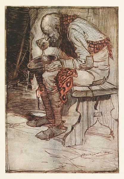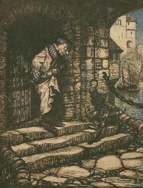 Arthur Rackham made this illustration, "Taking the keys of the castle, Jack unlocked all the doors," sometime in the early 20th century, using ink and watercolor. I love the looseness of his lines and the almost muted quality of the colors. You can feel the speed and freedom of his hand at work. He creates this eerie scene using a limited palette, mostly browns and grays, punctuated by pinks and reds. If you look closely at the ogre, you can see the texture that Rackham achieves with cross-hatching. The lines are so free and yet so precise, defining the contours of his grotesque face. His use of layering and transparency in the watercolor gives the scene a ghostly, ethereal quality. The ogre's exaggerated features, the flowing lines of the women's dresses, and Jack’s movement all combine to create this sense of unease. It reminds me of Paula Rego, who also uses fairytale imagery to explore darker, more complex emotions. Ultimately, the power of Rackham's work lies in its ability to evoke a sense of magic and dread.