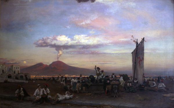 Editor: Here we have "On the beach of Naples", an oil painting by Oswald Achenbach. I'm immediately drawn to the vastness of the scene, that big old volcano brooding in the background… What stories do you think are swirling within it? Curator: Oh, stories aplenty, I reckon! But not just volcanic ones. Achenbach has this knack for capturing a bustling humanity nestled against the backdrop of raw nature. He gives you both, but it's that dance between humanity and the landscape where it gets fascinating, doesn’t it? Like watching actors on a stage, their movements echoing life's rhythm, or at least their part of it. Now, where do *you* think this dance leads? Editor: I guess it feels… nostalgic? Like a moment caught in time, with a certain melancholy about it. Are all the people going to be okay? Will the volcano blow? Curator: Melancholy is an excellent choice, spot on! Romanticism has an eye for it, and you’ve got it too, but a smattering of realism always offers an anchor for reflection. But maybe, instead of fear, the volcano is part of everyday life for these figures, and something so huge, terrifying, sits alongside a lover’s tiff, or the day’s wages… Makes it all the more vibrant, don’t you think? Editor: I never considered that. So it's about the interplay of the epic and the everyday? Curator: Precisely. Achenbach is saying something essential: life happens whether you’re dodging lava flows or just trying to make rent! Perhaps it even suggests it’s our perception that separates those anxieties, eh? Editor: It’s made me look at the piece in a completely different light. Curator: Good, isn't it? Perspective’s the paintbrush that colors everything.