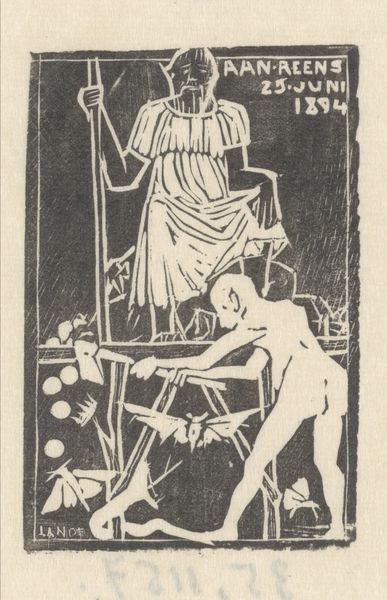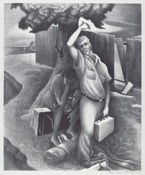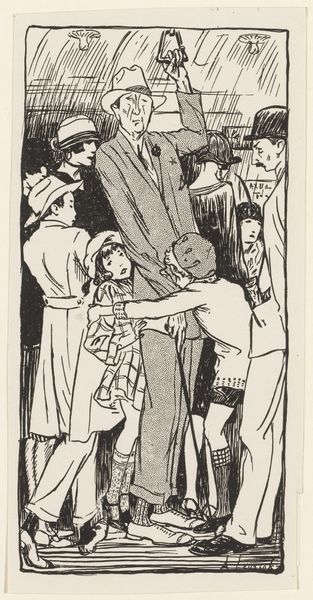 Curator: This is Charles Robinson’s “They Saw a Dove Hovering Above His Head” created in 1909. It is executed in watercolour. Editor: It has a dreamlike quality. I'm struck by the stark whiteness of the dove against the muted greens and browns, it really draws the eye upward. Curator: Absolutely. Robinson was associated with the Pre-Raphaelites, and this piece fits into their interest in medieval subjects and heightened emotion. This specific scene illustrates a moment of divine encounter, the dove representing the Holy Spirit. Its presence here really disrupts the material reality for the characters, challenging conventional interpretations of masculinity. Editor: Considering its time, watercolour illustrations like this depended upon industrial pigment production for its vivid colours, although the application is quite subtle. This piece appears delicate, but think of the complex material chains involved in its creation and dissemination at the turn of the century. There's a tension between its imagined medievalism and the modern conditions of its production. Curator: And consider too how that impacts the characters' positioning. The central figure in red appears to be at a crossroads, possibly questioning their purpose. The watchers in the background are equally positioned within what seems like a moment of reckoning or realization of place, the relationship to which can feel quite contemporary given ongoing theological discourse on identity and agency. Editor: Looking closely, it's clear that the execution here is fairly efficient. The texture of the rocks and foliage are indicated quickly. It’s almost as if the material conditions pushed a certain rapidity to the mode of production for book illustrations like these. Robinson clearly understood his craft's industrial context, allowing the illustration to occupy and even comment upon the narrative’s tensions. Curator: The deliberate placement of the book at the figures' feet feels symbolic; perhaps an old dogma discarded in light of the new divine experience or revelation the subjects of the artwork are witness to. Robinson challenges the prevailing social and political orders by depicting a shift in power and knowledge, even if in a fantastical setting. Editor: It makes me consider how much material culture is implicated in our interpretation. Thanks to easily obtainable pigments, Robinson democratized Pre-Raphaelite symbolism through mass reproduction of the printed image. An angel above could not reach a wider audience, I daresay. Curator: Indeed, thinking about "They Saw a Dove Hovering Above His Head" now really illuminates the fascinating convergence of the sacred and the sociopolitical, as well as the enduring questions around purpose and identity in the modern era. Editor: I agree. It has revealed how material means affect not just access to the image, but informs the nature of seeing and producing narrative itself.