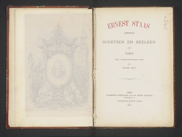 Curator: Today, we're looking at the opening pages of "Ernest Staas, advocaat: schetsen en beelden," a print from 1875. Editor: The piece, even in its book form, immediately evokes a sense of fragile intimacy. It’s all delicate lines and faded paper, creating a muted, almost dreamlike quality. Curator: Absolutely. This print, which translates to "Ernest Staas, lawyer: sketches and images," by Anton Bergmann presents a glimpse into the professional and cultural milieu of the time. Staas himself seems to have been a man of considerable standing in Ghent, Belgium. The second page of the work contains the title. Editor: The cover, though somewhat faded, hints at a fascinating tension between the serious profession – law – and the implied artistic contents of sketches and images. And the red historical font lends it a distinctly old-world aura. Does the image in the oval of the opposite page depict Mr. Staas? Curator: It is, presumably. Considering that the printing was done nearly 150 years ago, this piece can really reveal to us concepts of gender, identity and even class status in Belgium. Editor: Indeed. The figure is obscured somewhat and that evokes the passage of time and shifting cultural relevance. I wonder, how was Mr. Staas viewed by the artists themselves? And did his depiction embody specific values or attributes associated with his profession? Curator: Exactly, it’s also interesting to consider what the intended audience might have thought and felt looking at a printed material. It almost romanticizes a part of their daily lives back then. The artist made this piece a ‘genre painting’ rather than just some title design or portrait. Editor: Thinking about the symbols and historical context gives us a richer understanding of the image and its world. Thank you for that illuminating viewpoint, shifting my perception of just a simple printed title into a layered, very telling glimpse into the late nineteenth century. Curator: Thank you as well, it's been really thought provoking to consider not just the historical moment, but also the long trajectory of meaning and relevance these images continue to have today.