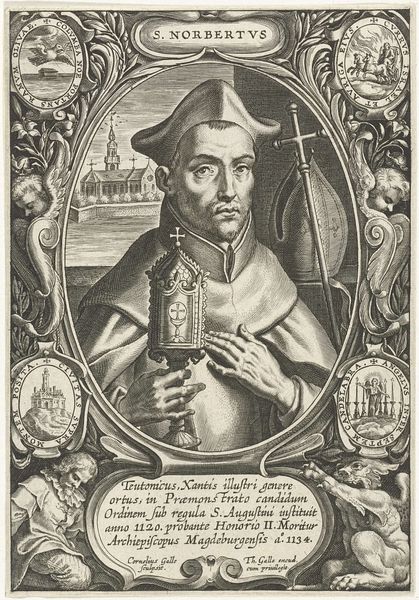 This is Pieter de Jode's engraving, Portrait of Pope Innocent XI. Made with burin on paper, the tight composition immediately commands attention. The oval portrait, bordered by cherubic figures, presents the Pope in a formal pose, his gaze direct, his hand gesturing outward. The meticulous lines and hatching create areas of light and shadow that not only define form, but also convey texture – from the soft fur trim of the Pope’s cap to the smooth skin of his face. The texture evokes a tactile quality, inviting a sensory connection with the image. The semiotic layering here is rich; the cherubs, the papal insignia, and the all-seeing eye function as symbolic markers of power and divinity, reinforcing the Pope’s authority. Yet, these symbols are not merely illustrative; they are integral to the work’s structure, anchoring the composition and guiding the viewer's eye through layers of meaning. Note how the formal, symmetrical structure of the engraving subtly underscores the rigid hierarchy of the Church while also engaging with broader questions about representation and authority in the late 17th century.