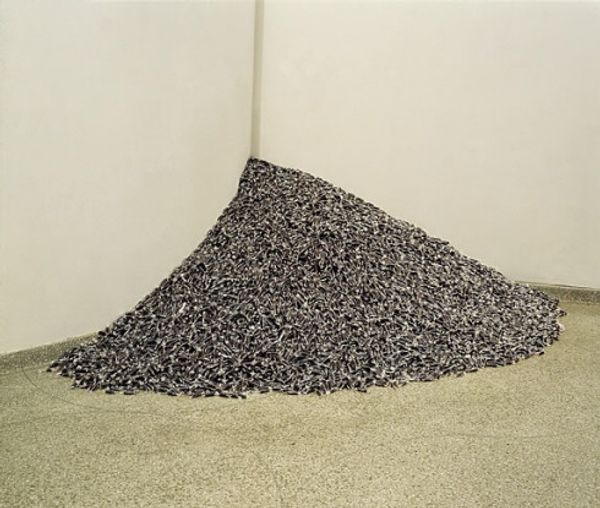 Curator: In 1990, Félix González-Torres created "Untitled" (A Corner of Baci). It's fascinating how he transformed everyday, commercially produced sweets into something deeply contemplative. Editor: It feels…almost unstable. A glittering cascade of impermanence pinned into a corner. All those little wrappers look like discarded husks, like after a celebration—or a feast—the quiet left after love or lust, both satisfied and... somehow sorrowful. Curator: Exactly. This isn't just about sweets; it’s about love, loss, and the ephemeral nature of life. The Baci chocolates, piled up against the wall, represent a weight, but also potential energy, and each represents an individual entity in a larger unit. Viewers are invited to take a piece. Editor: The action of taking one... That's critical to the concept, isn't it? Like, consuming an artwork seems almost sacrilegious in traditional art circles, but this deliberate accessibility transforms the artistic experience itself. By using readily available, mass-produced items like chocolates, there's this subversive shift that democratizes art, bringing it down from the untouchable pedestal to a level that encourages open access and interaction. The line between 'high' art and everyday materials blurs here and opens up conversations about consumption. Curator: Yes. This dissolution, this giving away, directly engages with themes of disappearance. Each stolen chocolate is like a stolen moment, a subtle echo of the AIDS crisis, in which the body itself disappears piece by piece. This piece directly evokes decay, as he directly engages the act of sharing with vulnerability. Editor: Thinking about the context and González-Torres’ personal life adds another dimension. These shimmering treats carry layers of political and emotional weight beyond what's on the wrapper. He truly mastered making potent metaphors out of common items. Curator: Right. It makes you question the inherent value of things – material and immaterial. How does value shift through experience and sharing? Editor: Exactly. What remains once something physical is used up, consumed, given away? This piece provides a surprisingly profound reminder that maybe what we consider precious is just as precious in disappearance, as it is in being there in the first place.