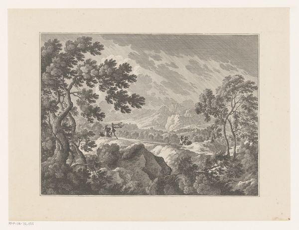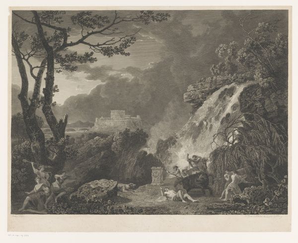 Editor: We are looking at Richard Earlom's engraving, "Landscape with Meleager and Atalanta Hunting the Calydonian Boar," created sometime between 1771 and 1779. The light in this image seems to cascade from the sky, emphasizing the turmoil of the boar hunt. I'm struck by how chaotic yet beautiful it is! What do you see when you look at this piece? Curator: Chaos, beauty…yes! Earlom grabs you, doesn't he? For me, it's the sublime clash of myth and nature. We've got this almost theatrical staging – look at the poses! – set against a backdrop that's wildly untamed. A proper wrestling match between order and disorder, if you will. And that distant fortress – does it hint at a fragile civilization facing nature's raw power, perhaps? Editor: It could, with the solid, blocky architecture juxtaposed with the natural world. Is it important to consider this through a Romantic lens? Curator: Absolutely! The Romantics *ate up* dramas like this. That waterfall, for instance – it's not just water; it's raw power, an unleashing of the natural forces that dwarf humanity. You feel it in your gut, don't you? Earlom gets you right *there.* Editor: He does! So, would it be right to say Earlom invites us to contemplate humanity's place within this grand, and at times hostile, landscape? Curator: Precisely! Think of it as less a literal illustration of a hunt and more an exploration of themes, such as courage, fate, the eternal battle between humanity and untamed nature... plus maybe a subtle nudge that even heroes have bad days and clash in rivalries! This definitely captures Romanticism’s essence: a touch of grandeur, a dash of drama, and a whole lot of feeling. Editor: Thank you; that really helped bring it to life! Curator: My pleasure! Now, go forth and wrestle with art... it's a wild ride!