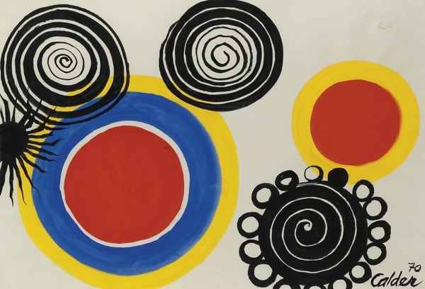 Alexander Calder made this gouache on paper, titled 'Enchantée' in 1972. At first glance, the floating geometric shapes evoke the whimsy of a child's mobile, one of Calder's best-known inventions. But let's consider the social landscape of the early 1970s. Calder was by then an established figure in the art world, and his work had become deeply embedded in the institutions of art and design. 'Enchantée' can be read as a self-conscious commentary on the commercialization of modernism. The bright colors and simplified forms, while playful, also hint at a kind of mass production, a knowing nod to the commodification of art in a consumer-driven society. The snake slithering at the bottom may even slyly reference the art market itself! Understanding Calder's place in the history of art requires us to research the social conditions that shaped his work. By consulting exhibition catalogs, critical reviews, and historical accounts, we can better understand the complex relationship between art and its cultural context.