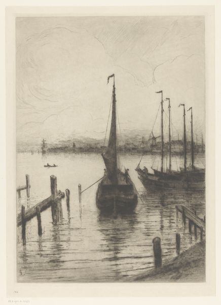 Curator: Look at this etching, "Steiger in Papendrecht," by Carel Nicolaas Storm van 's-Gravesande, created sometime between 1889 and 1902. What catches your eye first? Editor: Definitely the mood, that subdued atmosphere! It's all delicate lines and gentle washes of grey. Makes me think of a hazy, almost dreamlike memory. The lamp post seems so solitary, keeping watch. Curator: The use of line here is really extraordinary, especially in the reflection on the water. It reminds me of old Dutch seascapes but with a hint of impressionistic blurring. It's realism viewed through feeling. What could a pier have signified to van 's-Gravesande? Editor: Piers are often places of transition, the edge of stability and the pull of the unknown, of adventure. He would have captured a key transition between industrial advances in his present and the established trading systems of the past. Consider how liminal spaces often embody deep, unspoken desires, and the pier really carries that idea in an enduring way. Curator: I agree. The location, Papendrecht, would have been a busy harbour at this time. Perhaps this rendering strips it of it's reality and moves the subject into something more...poetic? It captures the essence of a specific time, place, and even emotion in an inimitably individual manner. Editor: Absolutely. The buildings looming hazily in the background also take on a certain symbolism – hinting at a societal structure and our human reliance on shelter, but rendered vaguely, as if even solid foundations might eventually dissolve back into mist. And that tiny little detail of the flagpole adds a similar human element! Curator: And that single light atop the piling guides both boats and men safely to harbour, a powerful metaphor. Editor: Indeed! Storm van 's-Gravesande transformed what might seem like a mundane scene into a potent reflection on memory, longing, and the enduring interplay between humanity and the water that surrounds us. I might view every old pier as this drawing's direct descendant from now on!