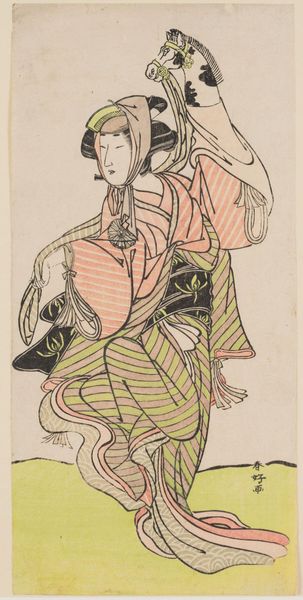 Curator: Welcome. We're standing before "Bloemenverkoopster," created sometime between 1730 and 1740 by Okumura Toshinobu. It appears to be a woodblock print, showcasing a woman selling flowers. Editor: It's deceptively delicate at first glance. The pale hues create an air of subdued elegance, but then your eyes trace the bold outlines and geometric patterns of the kimono and it feels altogether less straightforward. Curator: It’s fascinating how Toshinobu integrates a woman, seemingly a flower vendor, into a commercial space. The woodblock printing would have been a key aspect of commercial art at the time, expanding visual representation in Japanese society, wouldn't you say? What would her role represent in this society? Editor: Absolutely. This print, rather than simply depicting a woman selling flowers, subtly hints at gendered labor roles, commerce, and the intricate ways beauty is produced and marketed. Looking at it today, one thinks of performativity, that what is happening is on multiple levels of commerce. Curator: And in these prints, such women became idealized figures, reinforcing societal expectations while also potentially challenging existing social norms. Editor: That hat! The scale is intriguing – those blossoming cherry details compete for visual dominance with the vendor herself, which perhaps speaks volumes about what really attracts our gaze. What's really being offered? Curator: Exactly. And consider the floral motifs embedded within her clothing. Flowers are also integrated into the display from which she sells. In contrast, we get an inkling about the rapid urban developments during the Edo period where this piece fits in. Editor: The framing also directs the interpretation. Her beauty—bound by expectations around adornment, composure, presentation— is being commodified in the markets. We're complicit viewers, made aware of her position through this transaction of observing her. Curator: Considering that context, seeing this “Flower Seller” not just as an aesthetic object but as a socio-historical document definitely changes the work and enhances one's comprehension, I think. Editor: I agree, seeing art history meet contemporary cultural understanding, framed as gender, race and class representations enhances our critical awareness—it reminds us the art object lives, breathes and remains political.