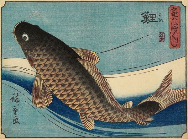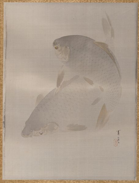 Curator: Allow me to introduce "Common and Golden Carp" by Ohara Koson, a striking color woodblock print created around 1935. Editor: My first impression is how serene the composition feels, despite the bold colors of the fish. It’s interesting how Koson uses such a flat perspective yet creates such a sense of depth. Curator: Indeed. Let's consider the technique. The process of Ukiyo-e prints involves a collaboration between artist, block cutter, and printer, each playing a vital role in bringing the image to life. Koson was working within a very well-established and regulated commercial structure that he inherited, which emphasizes how much control these artisans were able to develop. Editor: And thinking of symbolism, fish, especially carp or koi, are powerful images throughout much of Asian art and lore. They're frequently associated with perseverance, achievement, and the overcoming of obstacles – that legend about carp swimming upstream to become dragons, springs to mind immediately when I observe the motion in their fins and bodies in Koson's composition. Curator: Right, that ambition is culturally quite pertinent. Now, look at the choice of colors. The juxtaposition of the common carp with the golden variations suggests a deliberate commentary. Editor: Absolutely, the colors emphasize the symbolism. Gold, of course, universally signals wealth, prosperity. Placing it alongside the more "common" dark carp, the artist might be playing with social and economic themes of his time. Maybe the artist uses that symbolic association ironically or ambiguously. Curator: Irony's presence or lack in this piece hinges so strongly on how this piece would have circulated, don't you think? Who were these works being printed *for*? The commodification of Koson's work adds another layer to these symbols: mass production techniques allow for their democratization and dissemination. Editor: Ultimately, Koson’s elegant integration of naturalism and potent visual symbolism creates an intriguing viewing experience. This print gives much for consideration in terms of artistry and meaning. Curator: Absolutely, the blend of accessible subject matter with sophisticated printing techniques renders this print an exceptional snapshot of an artistic and social moment.