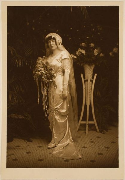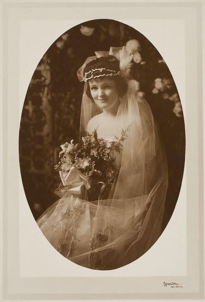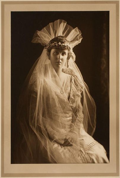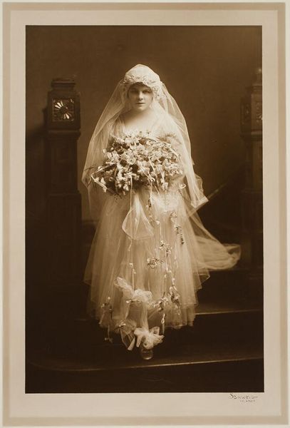 Editor: Here we have Martin Schweig's photograph, "Untitled (bride and flower girl)." It's a sepia toned image, very delicate. What strikes me is the texture of the fabrics, all those layers! What do you see when you look at this photograph? Curator: The materiality speaks volumes. Consider the labor invested in creating the bride's dress - the lace, the silk. These were not mass-produced items; they represent a certain social class and consumption patterns. How does the image itself, as a manufactured object, contribute to this understanding? Editor: That's fascinating, I hadn't thought about the dress in terms of labor. I was just admiring the aesthetic of it. Curator: Exactly! The aesthetic is built upon a foundation of material realities and societal structures. Thinking about that gives the photograph new meaning, don't you think? Editor: Definitely. Thanks for pointing that out!