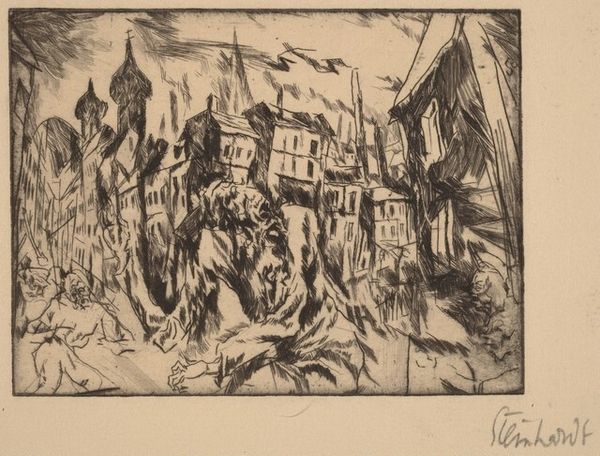 Editor: This linocut print, "Goatherd with his flock in the mountains" by Ernst Ludwig Kirchner, created sometime between 1890 and 1938, strikes me as incredibly dynamic, even chaotic. What’s your interpretation? Curator: It's more than just dynamic, isn’t it? It’s a visual articulation of the tensions inherent in modernity itself. Look at how the rough, almost violent linework depicts both the figure of the goatherd and the landscape. Does that visual language resonate with anything else you have encountered in your studies? Editor: Well, the chaotic composition and the angular lines make me think of other German Expressionist works. Is Kirchner using the landscape to reflect something about the individual or society? Curator: Absolutely. This piece, made between 1890 and 1938, reflects a period of intense social and political upheaval in Germany. The goatherd, seemingly at one with nature, could also be interpreted as a figure struggling against it. Are we seeing an idealized vision of pastoral life or is it a depiction of alienation from a rapidly industrializing society? Editor: That’s interesting. So, the contrast between the simple life of the goatherd and the harshness of the printmaking style highlights that tension? Curator: Precisely. And think about the socio-political climate during that time. What might it mean to depict a rural scene while Germany was rapidly modernizing and on the brink of war? Editor: It feels like Kirchner is using the goatherd as a symbol, perhaps of a longing for simpler times or as a critique of where society was headed. Curator: Indeed. By placing the goatherd and his flock within this fractured landscape, Kirchner compels us to confront uncomfortable questions about progress, identity, and our relationship with the natural world. It forces us to consider whose experiences are prioritized in the march toward so-called progress. Editor: I never thought of it that way. I appreciate how it challenges the traditional, romantic view of nature and asks us to consider its socio-political implications. Curator: Exactly! And it’s through interrogating those visual strategies that we unearth the deeper societal critiques embedded within the art.