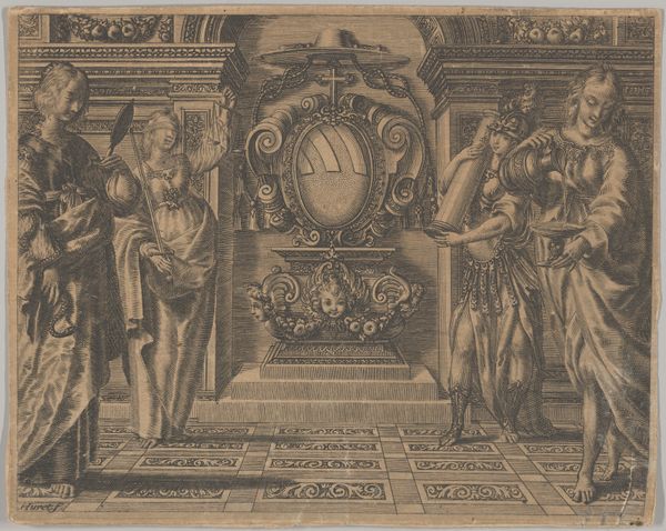 Curator: This engraving, held here at the Rijksmuseum, is titled "Allegorical Representation in Honor of the Jesuit Missionaries." Its creation is attributed to Claude Mellan, dating possibly from 1608 to 1688. Editor: It has such a powerful hierarchical structure. All lines ultimately seem to point upwards, toward the apex. I immediately see it as a study in reverence and aspiration. Curator: Indeed. Consider the historical context. The Jesuit order was instrumental in the Counter-Reformation. This piece would have circulated to bolster the image of the Jesuits and reinforce Catholic dogma amid religious and political upheaval. It serves as an artifact of institution building. Editor: Observe how Mellan utilizes line as form here; his Baroque sensibility structures meaning as content. From the detailed renderings of figures representing continents, to the angels holding laurel wreaths, each element reinforces the overall theme of global evangelization, doesn't it? The lines become rhetoric, essentially. Curator: Yes, look at the Jesuit figures at the center, beneath that radiant symbol, quite likely the “IHS” Christogram—the intensity of faith embodied! To the sides and below, all is grounded in earthly domains: Africa and Europe represented by their distinct heraldry. A testament to Baroque grandiosity intended for propagandistic use, undoubtedly. Editor: Do you agree it projects such idealized authority? Each symbolic device reinforces that intention. But looking at it purely aesthetically, the high contrast intensifies drama. The open sky and the figures hovering within evoke this sensation of boundlessness and almost ecstatic piety. Curator: Beyond artistry, it is an historical instrument, an embodiment of power relations—both temporal and divine. That pyramidal compositional approach would naturally lead the 17th-century gaze, with it reinforcing an entire structure of seeing. Editor: Yes, by directing focus it’s certainly manipulating narrative! Mellan harnessed that symbolic bandwidth by placing all compositional structures into a teleological service. Now seeing how line constructs hierarchy has added a whole other dimension of engagement for me. Curator: To grasp this engraving completely demands acknowledgement of those socio-cultural factors operating when Mellan and his contemporaries translated belief into visual forms for early modern audiences. A critical perspective serves well in appreciating what we're looking at here today. Editor: And, if the artist effectively wielded line, then that means of pictorial language gives much deeper understanding. Ultimately, a visual poetics informs these gestures just as significantly. I see both equally now.