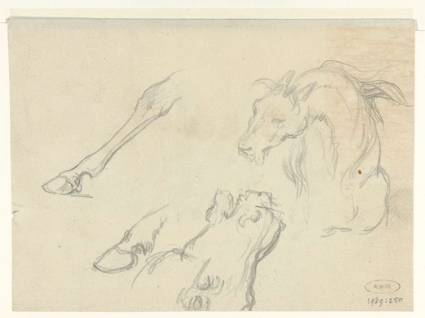 Curator: What a fascinating drawing! "Studies of a Dog" by Lorenz Frølich, created around 1840. It resides here at the SMK, Statens Museum for Kunst. Editor: Yes, I can see it is pencil on paper, judging from the visible grain, and the drawing presents several faint images of dogs, each seemingly in a different pose. It's quite ephemeral, almost ghost-like in its execution. Curator: Precisely, that fragility gives insight into the creation of art at the time. Drawing allowed for quick studies in preparation for paintings that served political or didactic purposes. Artists like Frølich shaped national identity and ideals through art intended for the broader public. Editor: So you’re saying even a seemingly simple sketch contributes to understanding national identity? Because to me, what is fascinating is the process visible here. We're witnessing the artist working through an idea, wrestling with form and light. There is an emphasis on the process and the physical labor, using a humble material. Curator: I see what you mean about its value for that labor! This piece shows us the transition to realist art in Denmark. Animals were becoming recognized, especially within a class structure in a country. Editor: In relation to labor and social values, yes. How domesticated animals fit into societal roles... and that informs the choice of material as well, I think. Pencil is easily accessible, utilitarian in a sense. A far cry from the elite association of oil painting. Curator: Very true. The democratization of art production via materials! What do you think the public made of these images at the time? Editor: Perhaps seeing studies like this humanized the artist, showed their work, and gave more validity to that which they were representing: animals, common things... I see now. What an interesting juxtaposition, given what the time signified. Curator: Indeed, viewing this drawing offers so much more than a quick glimpse at preliminary work; it presents societal considerations that help shape history! Editor: Absolutely. Looking at "Studies of a Dog", you see an interesting contrast: the means of creating high art using common materials that mirror changes in a burgeoning Denmark.