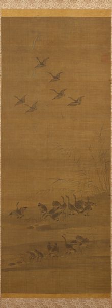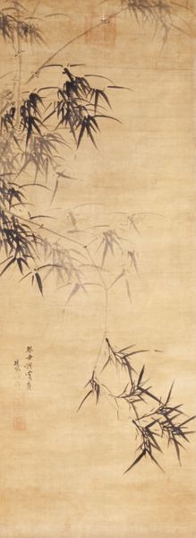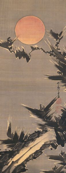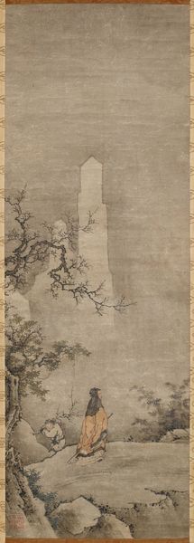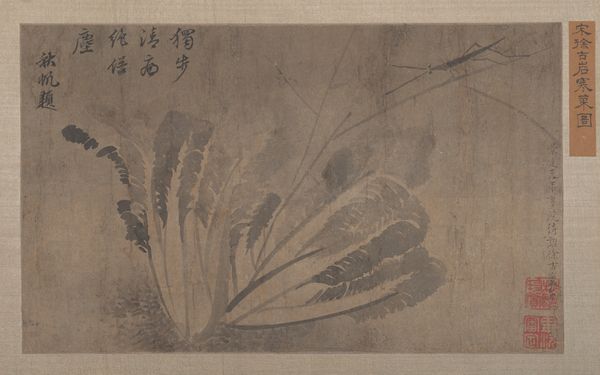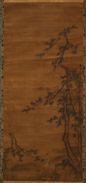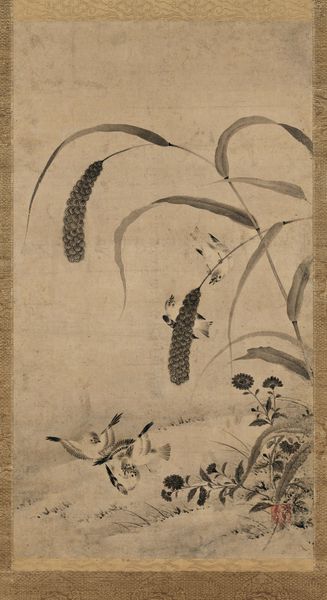 Curator: Here we have "Sparrow on Bamboo in the Rain," a hanging scroll in ink on paper, likely dating from the 15th century. It is now part of the collection here at the Minneapolis Institute of Art, and is traditionally attributed to the artist Muqi Fachang. What's your first take on this one? Editor: My immediate feeling is...melancholy. That little sparrow looks quite exposed. And the washes of ink give a real sense of a damp, chilly day. It also looks deceptively simple at first glance. Curator: Indeed. There's a real sense of Zen emptiness. I almost feel like the aged paper IS the painting, the drawing merely accents this aged canvas, bringing forth nature. I also notice the beautiful floral details along the edges. That looks to be brocade of some kind? Editor: Yes, and consider the paper itself, its production, and likely preciousness at the time. The level of skill required to paint with such intentionality and precision using those raw materials is really incredible. There's a great emphasis on labor there, wouldn’t you say? It speaks to me of trade, skill, preciousness. Not the preciousness of subject matter, but of material. Curator: And there's also that very East Asian artistic convention that an artist is creating an ideal; representing perfection rather than photographic reality. It feels as though it has been captured during a stolen, private moment. As though we've seen something intimate. That is something the artist's touch, their labor has done. Editor: Perhaps it is not so simple as mere labor, either. What's often missed is the socio-political contexts in which works such as this are made. I mean, were we to dig into it, I wonder about the status of the painter, who was commissioning, consuming these sorts of works? To fully analyze its creation, you really can't remove it from systems of power. What were the workshops like where artists were trained in these precise painting techniques? Curator: Ah, yes, absolutely essential questions. Though for me, in a gallery space, in a quiet moment... all that fades into this singular image, this delicate little sparrow in the rain. It reminds me to stay open to both the pain and beauty around me. Editor: And for me, it makes me contemplate the supply chains that lead to that brush touching the paper. Interesting how one little bird can make us go on completely separate tangents!