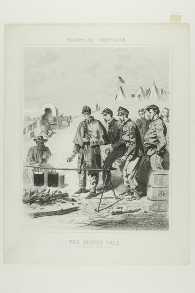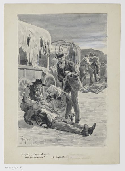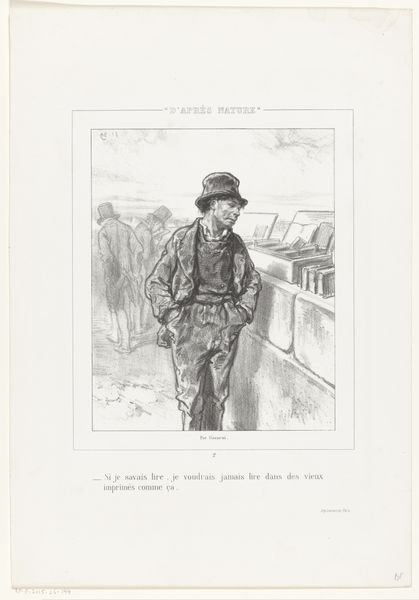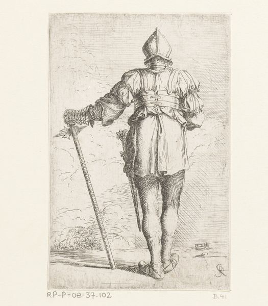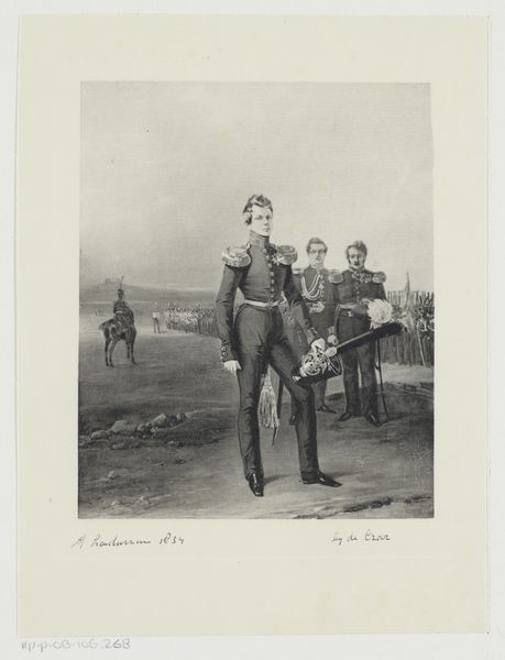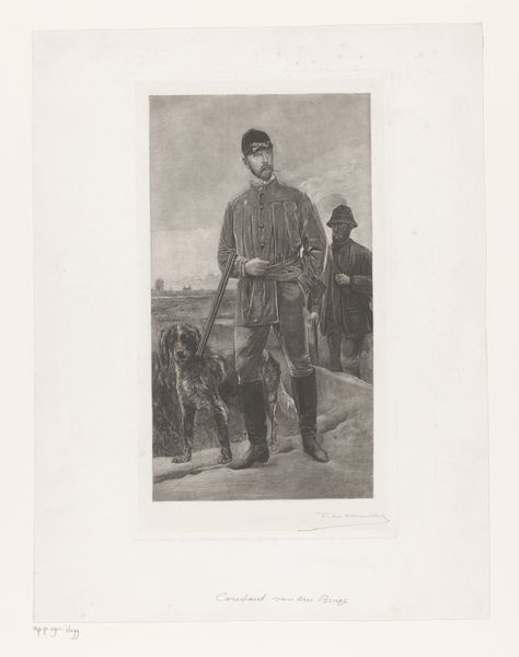 Curator: Here we have a piece entitled "Jagersportret van Constant Van den Berghe", made sometime between 1864 and 1911 by Frans Lauwers. It's a print, specifically an etching. Editor: The first thing that strikes me is this soft, almost melancholic feel to it. It’s a serious portrait. I'm feeling it through all this detailed line work. It seems as though the whole landscape holds its breath. Curator: The choice of monochrome and the medium of etching contribute to that mood. There's a tradition in portraiture of depicting the sitter with symbolic items, reflecting social status or personal traits. In this case, the subject, presumably Constant Van den Berghe, is shown with hunting attire and his dog, which would speak to notions of land ownership and aristocratic life. Editor: That dog looks like it wants to be anywhere but there. I’m wondering if Van den Berghe enjoyed being out in the marshes like that. Look at how closely the artist observed the garments, how they seem worn. He is very stoic looking. There's almost a sadness in his eyes, no? Is he proud, defiant, bored? I love this ambiguity. Curator: The presence of the second man hints at social hierarchy. He is somewhat relegated, shrouded in shadow behind the hunter. The details subtly tell us so much about power structures. You mentioned the garments, the rendering does create a sense of realism through texture. Editor: Yes, look closer—even though it’s a print, you get that rough feel of tweed or some heavy fabric, especially on the dog's fur. I am intrigued to know if it represents one instant or it speaks about life? Does that bond extend beyond work, out on the marsh? It looks so lonely for both man and hound. Curator: It’s true that etchings, because of their method of production, often carry the mark of the artist’s hand so completely. A skilled artist can translate a personality into these tiny lines, and hint at far bigger things. It offers an entry point for deeper thought, for me at least. Editor: I agree. Looking closely does evoke a sense of intimacy. There is certainly something about this melancholic hunter and his less-than-thrilled dog that holds our gaze, that speaks to the timeless and quiet solitude.