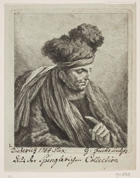 Curator: Immediately, the man's eyes strike me. There's a gravity in them, a weight that seems to pull the whole image downward, don’t you think? Editor: I agree. The somber expression contrasts starkly with the almost theatrical flourish of the hat. This print, "En mand med baret," or "A Man with a Beret," by Georg Mathias Fuchs, created in 1774, offers us a glimpse into 18th-century portraiture. The Baroque influences are still visible, particularly in the emphasis on ornamentation and drama. Curator: Ornamentation certainly plays a key role. I'm curious about that beret itself. The way it’s rendered almost seems like a halo. Is it possible that, on a symbolic level, it stands in for knowledge or elevated status? Editor: Potentially. Head coverings in this era often signaled status and profession. It also represents, to me, the power of adornment in the social and political theatre. In these portrait prints, class is always a central aspect. Curator: Absolutely, visual culture often serves as an essential signifier of a person's social standing. Also, thinking about the etching technique, you see the artist meticulously builds form through densely hatched lines to create these incredibly detailed textures. Editor: And look at how Fuchs manipulates light and shadow! The areas of intense darkness around the subject’s face seem to almost anticipate the dramatic contrasts we’ll see in the later Romantic period. It's quite impressive when considering its place within art historical movements. Curator: The way the man's gaze meets yours; it isn't passive. You are a party to this exchange. It reminds us of the very human need to leave an impression. We strive for our essence to persist beyond our time. Editor: Indeed. When considering a piece like this, we're confronted not only with aesthetics but also with how individuals navigated social constructs of their era. What does it mean, for instance, that the artist memorialized him this way and whose gaze benefits? These questions make it compelling. Curator: Exactly. Seeing "En mand med baret" reminds us how much symbols retain the ability to move across time and change meaning depending on where and how you see them. Editor: And situating it within a framework of power reveals that it's more than just art. It's evidence of the ongoing social forces influencing artistic expression.