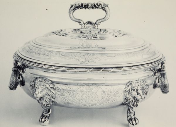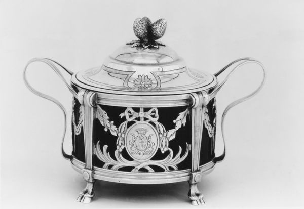 Curator: This elegant piece is one of a pair of covered dishes crafted by Charles-Louis-Auguste Spriman, or Spriment, between 1778 and 1779. The material is silver. Editor: The piece appears weighty and imposing, like a display of aristocratic wealth. Is that crest embossed into the side? Curator: Indeed it is, such presentation pieces reflected not only luxury, but the owner's status, aspirations and position within society. Silver like this served not just utilitarian needs, but the equally vital task of conveying prestige. Editor: Exactly. Think about the artisans, their skills. I’m intrigued by the process of crafting this from raw materials. The chasing and engraving are exceptionally refined. How many hands shaped it and where would this craft have been taking place? Curator: Goldsmiths like Spriman held elevated positions within the guilds of the era, wielding power in Paris, where workshops employed specialists— from those who refined the silver to the master who applied the finishing details and signatures. This very piece exemplifies their skills and expertise! Editor: So much labor concentrated into one serving dish! Who commissioned such objects? Did their aesthetic preferences reflect certain social or political views? Curator: Undoubtedly. Patrons were usually nobility, royal court members or rising bourgeois who were eager to establish their lineage through family crests. Owning exquisite items signified connections to the elite circles that directed taste and social change, using silver and decoration for their agenda. Editor: It becomes quite fascinating, thinking about these dishes moving between different collections through wars and revolutions and changing tastes. From private homes of royalty to our gallery. How interpretations evolve! Curator: A transformation, for sure. We bring the stories, methods, and significance of such creations to our public, enriching experiences beyond just an aesthetic evaluation! Editor: Well, it gives us pause for reflection, this vessel. It is more than decorative—it acts as a link connecting skilled craftsmanship, social narratives and powerful ambitions across historical chapters.