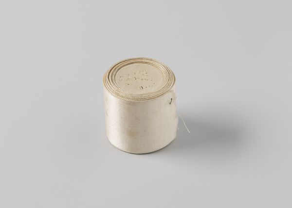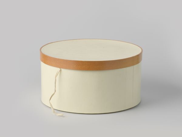 Editor: We’re looking at a photograph titled "Ovale hoedendoos van karton, bekleed met beige ripspapier" – that’s "Oval hat box made of cardboard, covered with beige rep paper"— dating roughly from 1934 to 1960, likely the work of the milliner Caroline Reboux, based on its association. The composition, particularly its simple geometry and neutral tone, evokes a sense of quiet elegance, almost austere. How do you interpret this work? Curator: This piece is captivating in its austerity, wouldn’t you agree? Stripped down to essential forms – the oval, the cylinder – the photograph focuses our attention on the subtle variations in texture and tone. The beige paper covering, described as "ripspapier," possesses a certain tactile quality, especially as captured by the camera. Notice how the light interacts with the slightly distressed surface; there is a tension created between the object's intended purpose and its state of being displayed here. What sort of semiotic observations can you draw from the box's closure? Editor: You mean the simple string closure on the box? Perhaps the raw string introduces a casual element into what is otherwise an exercise in very constrained shapes. What are your thoughts on this deliberate roughness in the composition? Curator: Precisely! The coarseness serves as a counterpoint, a disruption of the otherwise seamless visual experience. It speaks to the object's real-world functionality, a grounding element that prevents it from becoming purely abstract. Furthermore, it creates depth and reinforces the piece's formalism through texture juxtaposition. We could argue the box itself is merely a three-dimensional canvas for the play of light and texture. It compels us to dissect the relationship between form and utility. Editor: I hadn't considered that perspective. It is amazing how close formal observation reveals hidden intricacies. Curator: Indeed! And that is why looking deeply can be its own reward.