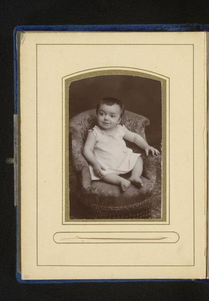 Editor: This is "Portrait of a Baby on a Chair," taken between 1890 and 1910, by Willem Gerhardus Kuijer. It looks like an albumen or gelatin-silver print, mounted in an album page. It has a wonderfully somber feel to it, despite its innocent subject. What stands out to you in this work? Curator: It's fascinating to consider this image as an artifact, embedded within a system of production and consumption. Look at the props – the upholstered chair, the child's clothing. These speak to the sitter's class status and the industrial processes that made them available. Consider the photographer too; did they own a studio? Who was their clientele? The gelatin-silver or albumen printing process, each has its own material requirements, from the photographic paper and chemicals. Editor: That's a great point! I hadn’t considered the material implications of even the chair. So you’re saying that everything, even seemingly innocuous elements like furniture and clothes, represents larger forces at play? Curator: Exactly. Think about the labour involved. The making of the photographic chemicals, the harvesting of the materials to make the album, even the manufacturing of that child's clothing. Who profited from these processes, and under what conditions were these goods produced? Editor: It gives me a whole new perspective! The portrait isn’t just of a baby, but also of a moment in economic and industrial history. So, what could a photograph like this say about craft versus industry in the late 19th century? Curator: Photography was a relatively new medium that was rising during a time where social status started to get captured and shared in these novel ways, yet we are reminded that, this one click of the button comes from so much labor throughout the entire process to that moment in time, questioning photography as “art.” Editor: I never thought about photography in relation to materiality and labour this way before. Thanks! Curator: My pleasure. Looking beyond the aesthetic is crucial. Now I am curious as to what else we can apply this perspective on.