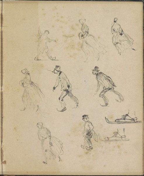 Editor: This is "Figurstudier," or "Figure Studies," by Martinus Rørbye, created in 1832. It's a pencil drawing, a series of figures sketched on a single page of what appears to be a sketchbook. The poses are quite dynamic, almost frenetic. What can you tell me about the formal qualities of this work? Curator: Observe how the artist utilizes line weight and hatching. The quick, light strokes suggest movement and immediacy, contrasting with the denser, more deliberate lines that define the figures’ contours. Note the absence of background; the figures exist in a non-space, emphasizing form and gesture over narrative. Editor: I see that, almost like the artist is prioritizing the human form and movement. It is less about identity and location and more about capturing a fleeting moment. Curator: Precisely. The sketch's energy emerges from the angularity of limbs and the torsion of bodies. The structural elements are presented as fragments. They convey a sense of unfolding possibility, almost a potential energy, before resolving into something concrete. Consider the interplay between suggestion and definition within each figure. Editor: So, by focusing on the formal elements like line and the absence of context, we see how the artist explores the body’s potential rather than a specific scene? Curator: Precisely. And what do you think the academic approach reveals? Editor: Viewing this as academic provides insights into training and practices within artistic institutions. Curator: Exactly. It encourages closer examination, helping us perceive artistry within Rørbye’s composition. What do you think about academic formalism versus romanticism in this picture? Editor: Seeing those features now allows a appreciation to what might have appeared unpolished. Curator: Indeed. We have new perspectives regarding the piece's complexities.