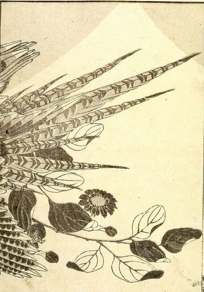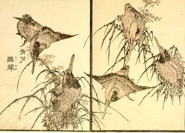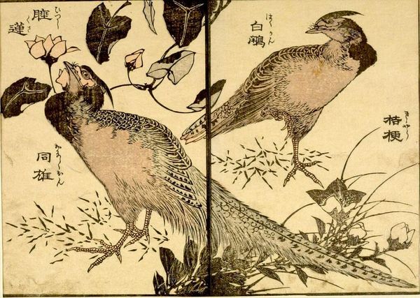 Curator: Here we have a page from the illustrated book "KachÅ gaden" by Katsushika Taito II. The composition features two birds perched on a pine branch. There's a simple elegance here. Editor: I'm immediately drawn to the textural contrast. The meticulous detail of the bird feathers against the rough, almost chaotic rendering of the branch is striking. What materials are we looking at? Curator: Woodblock print on paper. The pine, of course, is a powerful symbol of longevity and resilience in Japanese art. The birds, perhaps, symbolize conjugal fidelity. Editor: Knowing it’s a woodblock changes my perspective. Each line carved, each impression laid—a labor-intensive process to create this visual effect, far removed from the spontaneity it suggests. Curator: Exactly! The image reverberates with symbolic weight and layered cultural understanding. Editor: It's a confluence of process and icon, both informing the final result. A compelling example of art as skilled labor. Curator: The image carries an emotional weight shaped by both its creation and its symbolism. Editor: Indeed.