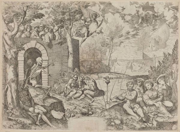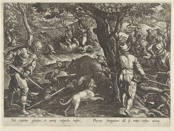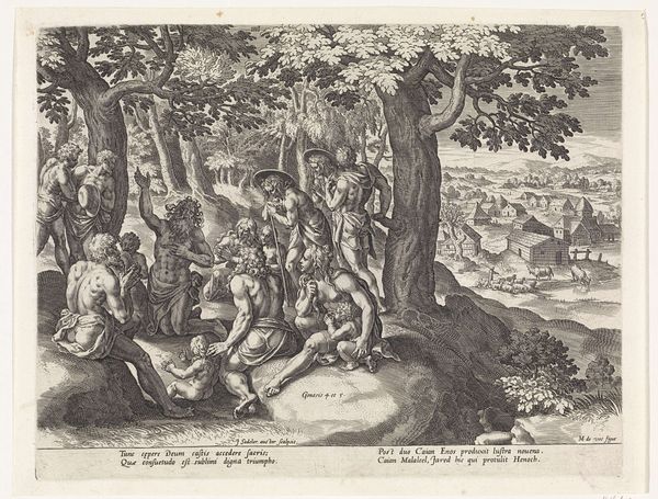 Curator: This engraving, "Jozef door zijn broers in de put gegooid," depicts Joseph cast into the pit by his brothers. It's attributed to an anonymous artist and dates probably from 1630 to 1702. You can find it here at the Rijksmuseum. Editor: Right away, it's so theatrical, isn't it? The deep shadows contrasting with these bright, almost frantic figures looming over this dark abyss. There is just something intensely ominous here. It looks less like siblings roughhousing and more like some twisted ritual is underway. Curator: Yes, it really captures the tension of the biblical narrative. Look at the faces—you can see a mix of envy, resentment, and even a bit of reluctance, maybe, amongst some of the brothers. And Joseph—he looks so vulnerable and helpless. This really leans into that dynamic of sibling rivalry. Editor: Helpless indeed! Thrown into a seemingly bottomless well by the very people meant to be his protectors—if that isn't a metaphor for familial dysfunction, I don’t know what is. Plus, the landscape isn't just background; those jagged mountains and dense, dark trees feel like they're in on the secret, echoing the brothers’ treachery. Creepy! Curator: Absolutely. And the choice of an engraving as the medium really shapes how we interpret it, right? This print would have been reproduced and circulated widely. It brings biblical narratives to the broader populace and reinforces moral lessons about jealousy and forgiveness, all through accessible visual language. Editor: Right! And seeing that text beneath…it kind of frames it all, doesn't it? As if the picture needs a backup explanation. Makes you wonder about the viewer back then; did they get all the feels from just the image alone? Now, it's like we're double-checking with SparkNotes! Curator: That's such an important point, though, about different interpretive frames. And for me it really draws our attention to what has shifted – our understanding and access. Editor: Yeah! From the perspective of today…this engraving kind of slaps you awake. Forces you to remember those age-old family feuds and how easily people can screw each other over, all with a fancy biblical backstory. So dark… and yet compellingly executed!