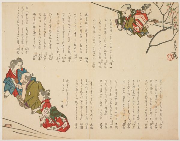 This print of three women in court attire was created by Matsumura Keibun in the late 18th or early 19th century. The scene presents a clear hierarchy. One woman stands, poised and seemingly in charge, while the other two are prostrated before her. Consider the implications of the prostration, a gesture seen throughout history. The act of kneeling or bowing before a superior, a deity, or a ruler is found across cultures from ancient Egypt to feudal Europe. It’s a physical manifestation of reverence, submission, or supplication. The emotional weight of such a gesture is immense; it speaks to power dynamics, societal structures, and individual vulnerability. The presence of these power dynamics suggests that the artist aims to tap into our collective understanding of dominance and submission, engaging viewers on a deep, subconscious level. Power structures, like the act of prostration, resurface, evolve, and take on new meanings, continuing a non-linear, cyclical progression through history.