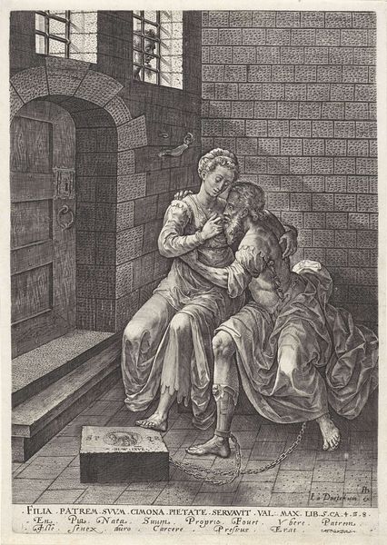 Editor: This is "Meeting of Joachim and Anna at the Golden Gate," an engraving made between 1508 and 1518 by Albrecht Altdorfer. It feels surprisingly intimate for a historical piece, like we’re catching a stolen moment. What do you find most compelling about this work? Curator: That's a keen observation. For me, it's the way Altdorfer captures the raw emotion of reunion. This wasn't just any meeting, mind you. Joachim and Anna were barren for many years and then, visited by angels, each learned they would finally conceive a child—Mary, mother of Jesus. The print, from a larger series about salvation, distills the feeling of longing fulfilled, grace received. What do you think the architecture surrounding them signifies? Editor: Well, the archway kind of frames them, putting the emphasis on their embrace. Maybe it suggests a sacred space? Curator: Precisely. The Golden Gate itself was a powerful symbol, representing entry into the sacred city of Jerusalem. Altdorfer masterfully uses line—think of the density versus the open sky—to build both narrative and emotional depth in a small format. Imagine crafting all of those tiny lines! Editor: It’s incredible. The texture adds so much, even if it's just black and white. Did many people see this piece back then? Curator: Prints were revolutionary, in a way, because they were relatively affordable and could be circulated widely. Altdorfer’s message could reach far beyond the church walls. Each impression became a sort of portable icon, carrying the seeds of faith and wonder. Isn't that amazing? Editor: It really is! I hadn't thought about how accessible prints made religious stories at the time. I’m glad you gave a broader perspective. Curator: And I learned from your insight about its initial intimate quality. It’s all about connections.