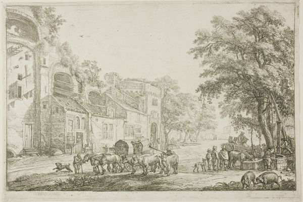 Editor: Paul Sandby’s “Inside View of Chepstow Castle Looking Eastward," shows a slice of 18th-century life, rendered in sepia tones. It feels… nostalgic, almost like a faded memory. What leaps out at you when you look at this? Curator: It whispers of time, doesn't it? Sandby isn’t just showing us a castle; he's offering a glimpse into a bygone era, a world where people, animals, and architecture coexisted in a gentler rhythm. See how the smoke from the chimney intertwines with the clouds, blurring the line between domestic life and the grandeur of history? Almost dreamlike. Editor: That's a beautiful way to put it! It makes me wonder, what stories do you think those castle walls could tell? Curator: Oh, darling, centuries' worth! Perhaps Sandby hoped we'd imagine them ourselves, these everyday encounters within the shadow of something so historically imposing. Food for thought!