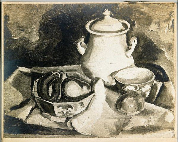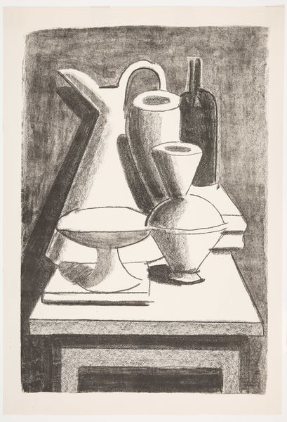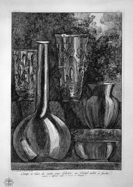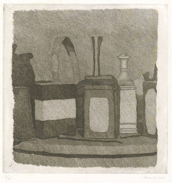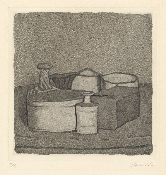 Editor: This is Giorgio Morandi's "Natura Morta a Grandi Segni" from 1931, an etching showing a collection of vases and bottles. I'm immediately struck by how the cross-hatching gives the whole composition a sense of quiet stillness. How do you interpret the symbolism embedded in these everyday objects? Curator: Look closely at how Morandi renders these vessels. Their simple forms—cylinders, rectangles, slight curves—hark back to a classic, almost archaic purity. These are vessels emptied of immediate function, yet brimming with potential, wouldn't you agree? Think of the symbolic weight the vase has carried across cultures—as container of life, death, ritual. What might Morandi be evoking through these shapes and their arrangement? Editor: Perhaps he's suggesting a sense of containment, or even of preserving something delicate and precious? The monochrome palette seems to reinforce that feeling of quiet contemplation. Curator: Precisely. And consider the influence of Italian Renaissance ideals on Morandi, notice how his work is steeped in tradition even as he embraced modernism. His arrangements of bottles can be viewed as a response to his cultural predecessors. The cultural memory resonates through the lines themselves. Do you sense a link between the artist’s internal world, and the cultural memory carried through form? Editor: I do now, thinking about how still life has always been used to reflect on life and mortality, and I appreciate that you helped me link the symbolic form to the psychology of both the artist, and viewer! Curator: Absolutely! Each viewing refracts layers of symbolism; our perceptions filter through psychological understanding and cultural narratives, adding layers to its ongoing story. We bring our own histories to the interpretation. Editor: This etching really reveals that what we see, is just a mirror for ourselves, thanks to its subtle symbols and quiet message. Curator: Yes, and as viewers we become co-creators, filling these emptied vessels with our own emotional content.