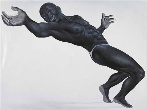 Curator: I'm struck by the figure's immense size, the slick black sheen of the skin, and the overall sense of distorted masculinity. What are your first impressions? Editor: Confrontational. The hyper-muscularity feels almost grotesque, amplified by the unsettling expression on his face. There’s a vulnerability too, conveyed by that tiny Speedo and the direct, wide-eyed gaze. It screams insecurities about performative strength. Curator: Absolutely. Let's unpack this a bit. This acrylic on canvas work is "Badanku Kurang Besar," which translates to "My Body Is Not Big Enough." It was created in 2001 by the Indonesian artist Nyoman Masriadi. Notice how the fork and spoon serve as almost talismanic objects in his hands. They replace traditional symbols of power or defense with…utensils. Editor: Right. They underscore the hollowness, perhaps even the consumerism, behind these exaggerated ideals. The medal ribboned to the figure's briefs feels similarly loaded—awarding what, exactly? Societal approval for attaining an impossible body image? Curator: The “5” on the medal might hint at a ranked system of such values in society, even. Perhaps Masriadi is speaking about a specific set of criteria or, quite simply, this placing suggests relative deficiency. It suggests Masriadi considers the nature of competition and self-worth within Indonesia’s emerging consumer culture at that time. The utensils are symbols of a sort, hinting towards sustenance in this specific race or struggle for supremacy. Editor: Precisely. I find Masriadi's juxtaposition of Western body-building tropes with his cultural critique especially potent. The character feels both hyper-masculine and incredibly childlike. What’s this image invoking regarding identity? What trauma or collective insecurity around appearance is the artist hinting towards? Curator: The artist uses a distorted almost grotesque image, highlighting themes around cultural identity through striking visual devices like exaggerated musculature alongside quotidian eating utensils. What appears as a critique may be simultaneously inviting further speculation, not resolution. The oversized figure hints towards psychological weight around societal anxieties about inadequacy or failure. Editor: So, on one level it can be about unattainable standards of physical strength, and on another, perhaps, a commentary about Indonesia's evolving place on a global stage. Thank you, it's such an intriguing image that unpicks conventional readings around power, form, and representation. Curator: Agreed, I think these ambiguities keep it fascinating to contemplate across changing social contexts. The piece continues to resonate on personal and more abstract levels as well.