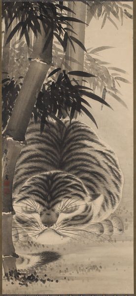 Curator: Looking at this hanging scroll, I am struck by the imposing size and weight conveyed, even in the delicate ink wash. Editor: Yes, it's quite striking! The Minneapolis Institute of Art holds this beautiful example of Japanese art. Attributed to Tawaraya Sōtatsu and dating from the 17th century, it's called "Tiger Licking Its Paw". What's your first impression? Curator: Its subdued palette certainly lends it an antique gravitas. Beyond the expert strokes of the brush, what captivates me are the symbolic interpretations of the tiger itself within Japanese culture. Tigers, often associated with strength and courage, served as potent emblems of leadership, especially military command. Editor: Interesting observation! And beyond leadership, the act of licking the paw. It's a gesture of self-care but in Eastern symbolism, such details often point to something deeper. Curator: Precisely. Self-care perhaps acts as a shield to defend or reflect inward power for strategy, as power politics require introspection. In Japan, images of tigers gained further political potency from their association with Zen Buddhism and warriors, making them vital figures of power. We have to remember how artworks participate in creating a shared iconography. Editor: It’s fascinating how that iconography crosses boundaries, the tiger as a protector and emblem of might seems universal. I note how carefully this one seems to be cleaning its claws. Not aggressive, almost contemplative, not the brutal predator one might expect. Curator: The artist masterfully captures the duality of the tiger myth, juxtaposing raw strength with an introspective stillness. Editor: Thinking of cultural memory, it’s a remarkable thing when you can feel both intimidation and vulnerability emanating from the same image across centuries. This little exercise offers such a rich way to examine political symbols within artwork! Curator: Absolutely, considering the public role of art and the forces that shaped them allow us to analyze works that endure far longer.