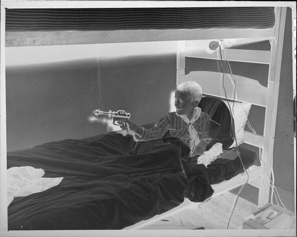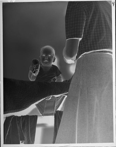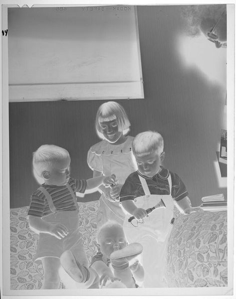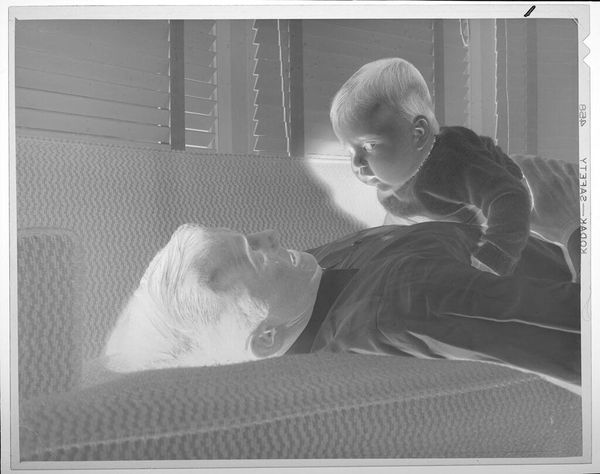 Curator: This is an untitled photograph by Lucian and Mary Brown, currently residing in the Harvard Art Museums' collection, depicting two babies on a bed after their bath. Editor: It's strangely unsettling, isn't it? The reversal of light and dark makes it feel otherworldly, like a glimpse into some eerie parallel childhood. Curator: Yes, the negative presentation significantly changes our perception. The children, paradoxically, glow, imbuing them with an almost angelic, or perhaps supernatural, quality. This transformation might speak to our idealized, yet often unrealistic, views of childhood innocence. Editor: I think that inversion, coupled with the intimate domestic setting, highlights the social construction of childhood itself. Are we seeing vulnerability, or something more complex related to surveillance and control, the gaze turned back at us? Curator: It certainly invites those interpretations. The recurring symbolic weight of children in art history suggests a continuous cultural dialogue around vulnerability, potential, and the future, filtered through ever-shifting social lenses. Editor: Absolutely. It reminds us that even the seemingly innocent is always already embedded in a web of power dynamics. A simple domestic image, yet powerfully resonant with contemporary concerns.