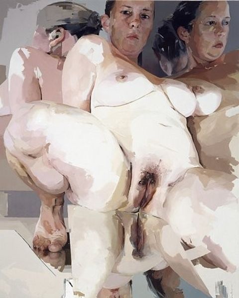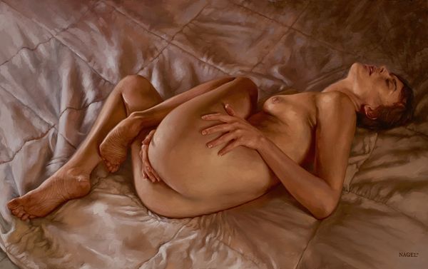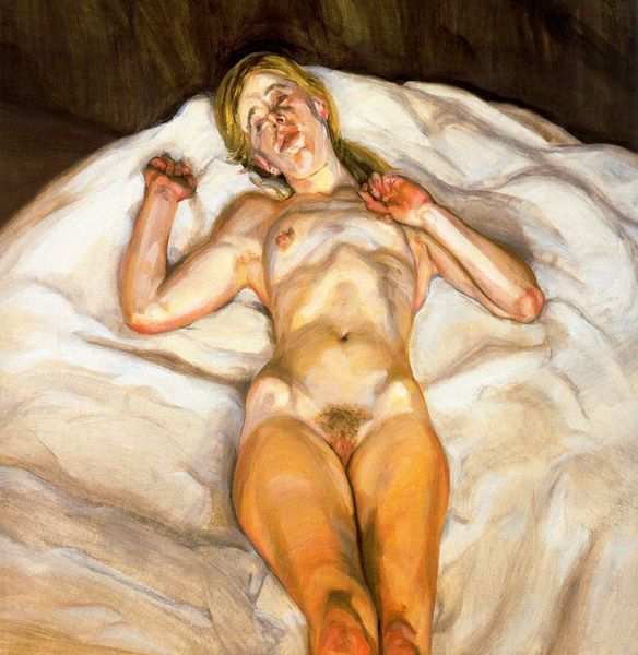 Curator: Well, that's confronting. And vulnerable. She looks exhausted, doesn’t she? Editor: Indeed. What we have here is Lucian Freud’s "Naked Girl with Egg," rendered in oil paint in 1981. A prime example of his unflinching gaze. Curator: Unflinching is putting it mildly! I mean, it’s brutal but beautifully so, somehow. It’s not romanticised, is it? It feels so real. That stark honesty… it's magnetic. What do you think about the scale? Editor: Scale is essential to understanding Freud. Consider how portraiture, historically, served as a display of wealth and status. Freud dispenses with that entirely. By enlarging the figure, and presenting her nude, he redirects the viewer's focus to the very materiality of the body itself. Stripped of artifice, she simply exists as pure form. Curator: Exactly. And that egg. It feels almost…biblical. Like an offering. Is she a sleeping Eve perhaps, dreaming of the serpent? What’s it all about do you think? Editor: That’s the intriguing bit isn’t it. There’s an almost clinical quality to the gaze; you could almost believe he sees his subjects not as people so much, as objects to be studied. But also there's the intimacy, perhaps uncomfortable, certainly voyeuristic. The setting is almost stage like with the drab backdrop really accentuating the curves of the subject. Curator: Voyeuristic is the word. It also feels very… him, very singular. I suppose that's why he and the School of London cut such striking figures amid other Modernist circles in painting at the time. No sentimentality, or at least if there is, it’s well hidden. And that fleshy rendering is also hard to look away from. Editor: Absolutely, he actively rejects the slickness and detachment often associated with modernism. This painting challenges those high modernist ideals. It engages directly with history and representation. So yes, singularity but equally a very public reckoning with image making as well. Curator: Well, I definitely have something new to think about after really sitting with that one. How about you? Editor: Yes, a potent reminder that the politics of the body never really goes away; this painting proves it can still evoke deep responses decades on.