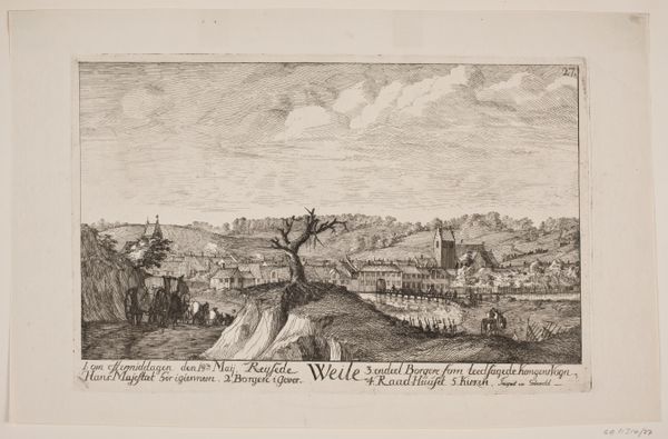Editor: So this is "Gezicht op Blâmont," a cityscape drawing made between 1657 and 1682. It's anonymous, but the Rijksmuseum holds it now. The detail in this baroque ink and engraving is stunning, but also a bit…stark? It almost feels more architectural than artistic, but maybe that’s just me. What do you see in it? Curator: Stark, yes, but isn't that fascinating? It feels like the cartographer’s cool gaze meets the artist’s trembling hand. Look how meticulously each roof tile seems rendered, each field plotted – a craving for order amidst the sprawl. Notice how the little figures almost feel like afterthoughts, almost comically placed, dwarfed by the sheer force of place? They add a touch of humanity but, I wonder, does the bird's eye view of this place allow the viewer to feel part of Blâmont's fabric, or distanced, clinical almost? Editor: Distanced, definitely. Like you're assessing it, not living in it. And now I’m wondering about those little people, too. Two pairs, one perhaps heading towards Blâmont and one walking away. Curator: Exactly! Each line, I suspect, has been weighted with intention. Where might they be heading? The walled city offers protection, prosperity; what reasons might those other figures have to walk away? A personal story tucked in an image obsessed with place... Now what would they whisper, I wonder? Editor: It really shifts how I see it – it's more than just a picture, it's an observation, a story waiting to be unfolded! Curator: That is the heart of art isn’t it. We find meaning as it dances, as the artwork’s stories become our own.