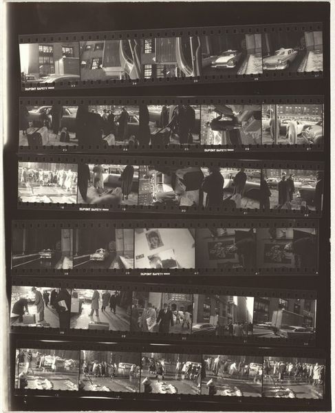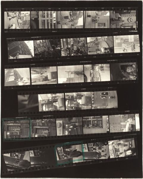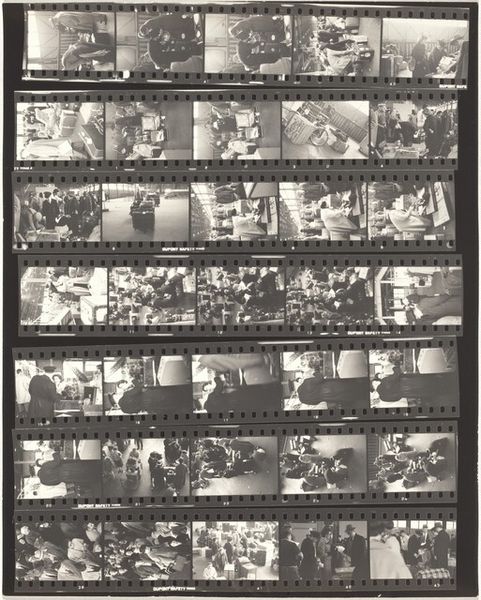 Editor: Here we have Robert Frank's "Subway no number" from 1955, a gelatin silver print. It looks like a contact sheet, a whole roll of film capturing scenes inside the subway. It's a fascinating snapshot, capturing everyday moments of city life, though tinged with a certain melancholy. What do you make of this piece? Curator: It's a fantastic choice! This isn't just a contact sheet; it's Frank's way of storytelling. Imagine him, hidden with his Leica, capturing fleeting moments. He wasn't after beauty in the traditional sense; it's more about authenticity, rawness. Notice how he uses shadow and light; the harsh contrasts add to that sense of unease and isolation, don’t you think? Like Hopper moved underground. Editor: Yes, the high contrast is striking. It makes the people feel very isolated, even though they are in a crowded space. It almost feels voyeuristic. Curator: Precisely! We are the silent observers here, piecing together fragments of stories. I believe Frank aimed to present the reality of everyday America as he witnessed it, rather than idealizing it. These seemingly mundane scenes accumulate meaning. Editor: What strikes me is the repetitive imagery: rows of backs, the tracks disappearing into the darkness. Is Frank making a statement about conformity, about the loss of individuality? Curator: Perhaps! The beauty of art, dear Editor, lies in its open-endedness. The repetition could also mirror the rhythmic motion of the subway itself, or perhaps the feeling of being trapped in a system. Editor: It's fascinating how Frank can evoke such strong emotions through these candid shots. Thanks, I learned something new about seeing beauty in unexpected ways! Curator: My pleasure! Now, let’s find a hidden message somewhere else!