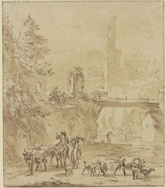 Johann Heinrich Roos made this ink and wash drawing of a herd crossing water in the 17th century. The artwork’s appearance is deeply influenced by the fluidity of the ink medium. Roos skillfully uses washes to create depth and volume, capturing the textures of the animals’ hides and the ruggedness of the landscape. You can almost feel the weight of the figures on horseback, and the relative lightness of the livestock wading through the water. The drawing’s monochrome palette evokes a sense of antiquity, aligning it with classical pastoral scenes. However, the subject matter – the everyday labor of shepherding – also connects it to the realities of rural life. Roos's work challenges traditional distinctions between high art and craft, elevating the depiction of labor through skilled drawing and a keen understanding of materiality.