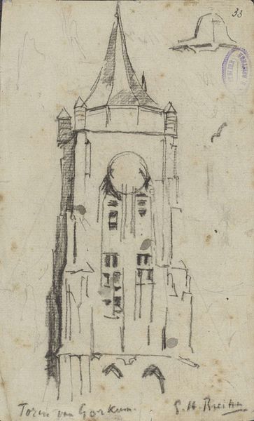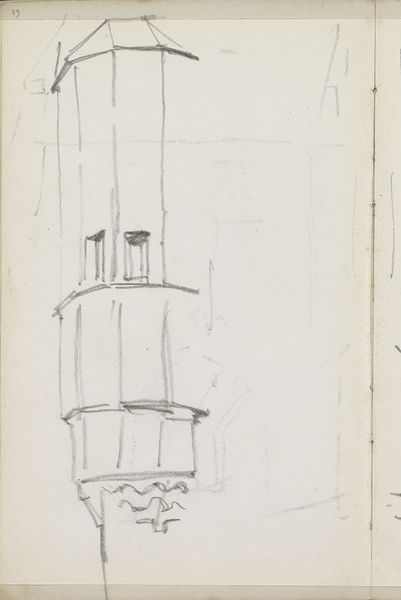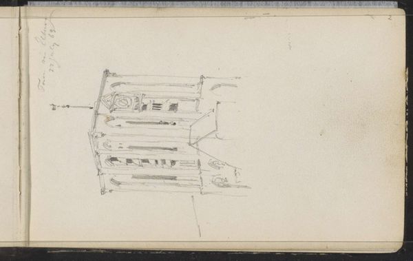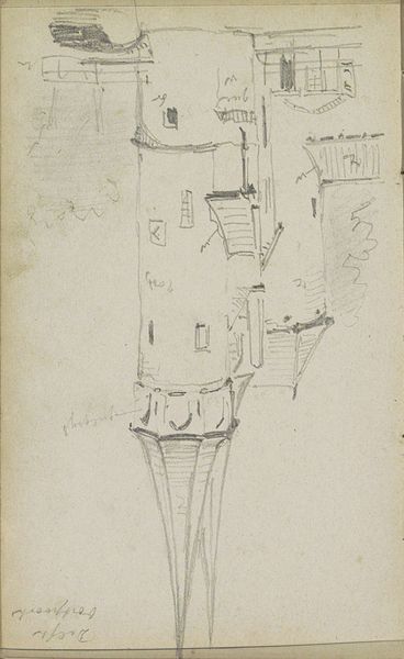 Karl Ballenberger made this drawing, "Umriss einer Fassade mit getrepptem Giebel," which translates to "Outline of a Facade with Stepped Gable," while working in Frankfurt in the mid-19th century. During this time, Frankfurt was experiencing rapid urban growth and industrialization, transforming its physical and social landscape. Ballenberger’s sketch captures the architectural details of a stepped gable facade, a style that reflects the historical consciousness and revivalism in architecture during the period. What interests me here is not just the facade itself, but the historical context it invokes. Buildings were not simply structures; they were statements reflecting cultural identity and aspirations. The stepped gable, with its echoes of medieval and Renaissance styles, suggests a desire to connect with a rich cultural past amidst the changes of the industrial age. As you look at this simple sketch, consider what it means to build, to preserve, and to remember in a world undergoing constant transformation. What aspects of our cultural heritage do we choose to highlight, and what do we leave behind?