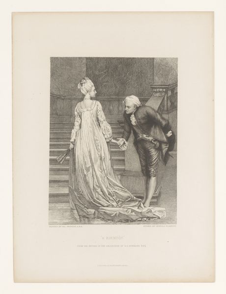Editor: This is Honoré Daumier’s lithograph, "He delights in the ball, plate 10 from Les Banqueteurs," created in 1849. It’s currently held at The Art Institute of Chicago. The movement within the image is captivating, particularly how Daumier uses line to create form and gesture. How would you interpret Daumier’s compositional choices? Curator: Note the strategic deployment of light and shadow across the image plane. Daumier directs the viewer’s gaze by placing darker forms—particularly the male figure and his garb—in sharp contrast to the lighter dress of his partner. The arrangement suggests a clear focal point. Furthermore, the figures in the background seem flattened, lacking individual detail, which concentrates our attention on the couple in the foreground. Consider also the lines; are they economical or elaborate? Editor: They appear quite economical to me. The background figures are created with very few lines each, almost like shorthand. While the main subjects have denser cross-hatching, even that is relatively sparse. Does this choice influence the overall mood? Curator: It does. The sparse, almost hurried lines impart a sense of immediacy and transience. The lack of meticulous detail forces the viewer to engage actively, to fill in the gaps, and interpret Daumier’s intent. In other words, Daumier privileges gesture and essence over photorealistic depiction. This technique anticipates modernist sensibilities regarding form and function. Is this pursuit successful? Editor: I find the artwork successfully conveys an animated feeling, while creating narrative through just a few structured marks. Thank you. Curator: A fitting conclusion; note how Daumier uses only line and tone to distill such rich dynamism, indicative of an artist masterful in exploiting the medium.