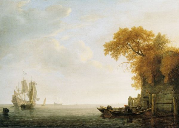 Aelbert Cuyp created this river scene with distant windmills using oil on wood. Immediately, you're struck by a tonal unity of diffused light, a hazy atmosphere that softens the scene. Cuyp masterfully uses color and composition to create depth and guide the viewer's eye. The muted palette, dominated by warm yellows and grays, suggests a serene, almost dreamlike setting. The composition is carefully structured, with horizontal bands of water, land, and sky creating a sense of balance. Yet, the artist introduces a subtle tension through the placement of the boat slightly off-center, destabilizing a perfectly symmetrical view. This arrangement speaks to a broader artistic concern: the interplay between order and dynamism. While the scene initially conveys tranquility, the subtle compositional choices invite us to consider the constructed nature of this calm, reminding us that art is not merely a mirror, but a lens through which we interpret the world. The atmospheric perspective is heightened by the blurred silhouettes of distant windmills, emphasizing their ethereal quality.