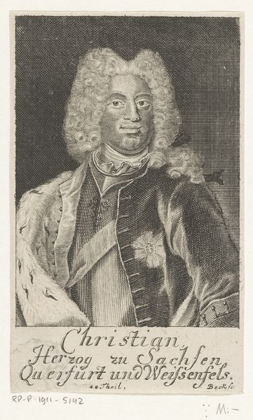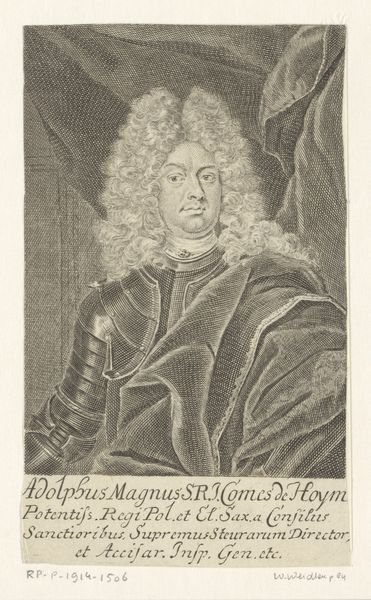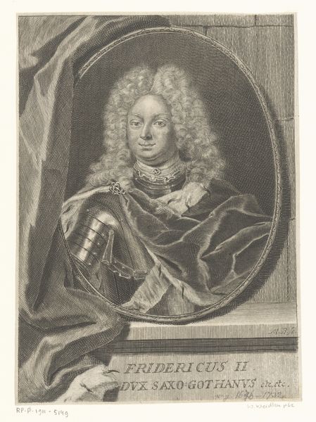 Curator: Tobias Gabriel Beck’s engraving, "Portret van Frederik II van Saksen-Gotha-Altenburg," created in 1726, offers us a fascinating glimpse into the past. Editor: It has a solemn feel. The cross-hatching gives depth, but also seems to weigh down the figure. What does the semiotics suggest? Curator: Precisely! The intricate detail in the armor and the opulent wig speaks to power, and Beck uses line to create a hierarchy of visual elements, leading our eye to the subject’s face. The contrast between the dark armor and the delicate rendering of the face suggests an individual defined by both martial prowess and aristocratic refinement. Editor: Right. It’s about the visual vocabulary of authority in 18th century European aristocracy. But there’s a performative aspect we shouldn't ignore. These portraits are inherently political tools, manufacturing and disseminating images of powerful men, mostly ignoring their often problematic histories. The wig, for example, functioned as a distancing signifier, further marking this man off from "common" subjects and reifying social divisions. Curator: An interesting take! The engraving technique itself adds a layer. The precision and clarity of the lines suggest a desire for objective representation. Editor: Perhaps, but objective for whom? Remember, images of power also perpetuate asymmetrical power dynamics. How were images such as these received and used? They don't only capture a face; they work as political currency. How might viewers receive it today? Curator: True. The composition does seem to be an attempt to capture Frederick's presence and status. Editor: Perhaps then we should view it, as viewers now, critically evaluating power rather than celebrating the mere artistic craftsmanship? Curator: Yes. Looking at this from different lenses enhances the viewer experience. Editor: Exactly! Appreciating how historical representations were used is key, no?