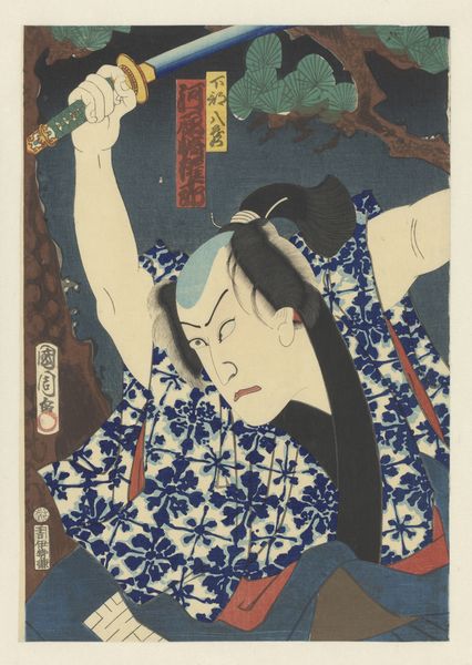 Curator: This dramatic woodblock print is “The new Taira emperor Masakado,” crafted between 1849 and 1852 by Utagawa Kunisada. It’s part of the Rijksmuseum’s collection. Editor: Whoa, it’s intensely theatrical, isn't it? That frozen expression, like he's caught between fury and fear… Curator: Precisely. Kunisada was a master of Ukiyo-e, or "pictures of the floating world," a style that frequently portrayed Kabuki actors in dramatic roles. Editor: The figure feels monumental, despite presumably being relatively small, like it captures more than the paper allows... Is he really staring at two headless figures there or am I just seeing that? Curator: That's right, yes. Those disembodied heads hovering beneath the moon play upon a legendary account wherein Masakado was decapitated, but his head flew around for some time. The figure is powerfully rendered in dynamic composition. Editor: So the dramatic colors in the kimono - I read phoenixes and elaborate foliage? It amplifies that raw emotion – maybe even overblown with so much ornamentation! The whole scene becomes incredibly evocative given those spectral forms hovering nearby... Curator: It’s a clash of opulence and horror, typical of Kunisada. His use of strong outlines, vivid hues and decorative patterns create depth, even within the flat perspective of the print. The rich color and fine detail of the phoenix are particularly compelling. Editor: Seeing it like that gives me new eyes—it's less a document, and more like tapping into a specific feeling from a past now lost to time. This makes me want to explore other works from that moment even though this wasn’t the piece that I had wanted to see on display. Curator: Utagawa Kunisada presents us with so much more than merely history; we have received an embodiment of both myth and visceral experience. It is certainly why the woodblock work retains its profound presence even now.