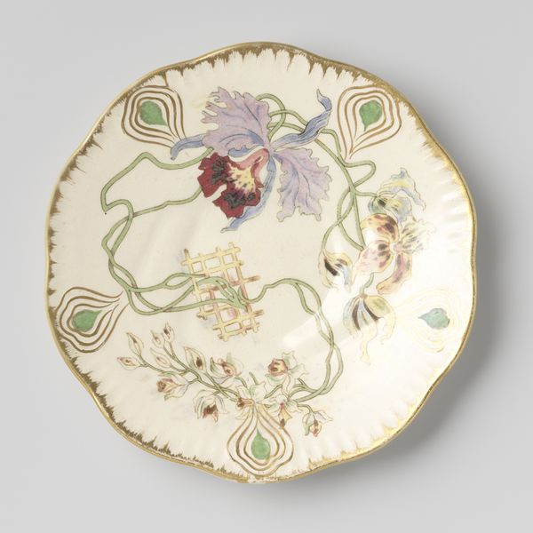 This teacup saucer was crafted at the Koninklijke Porseleinfabriek Dommer & Co. with delicate brushstrokes. The eye is immediately drawn to the centralized arrangement of objects, bound together by a soft blue ribbon, creating a sense of organized chaos within the circular frame. The objects depicted—instruments of leisure and perhaps war—are rendered with a muted palette, contrasting with the bright gold rim. The choice of porcelain as a medium lends a sense of fragility and refinement, characteristic of the era's material culture. Consider how this composition invites us to decode its symbolism: the drum, guns, and other accoutrements, each carefully placed, may signify aspects of aristocratic life. Placed against the pristine white background, these elements achieve a complex interplay between form and function, luxury and martial prowess. Note the deliberate placement and how it functions aesthetically and as part of a larger cultural dialogue about the values and material obsessions.