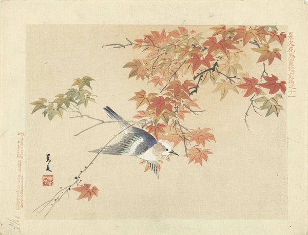 Editor: This watercolor print, "Bird and Persimmon," by Matsumura Keibun, created sometime between 1892 and 1897, presents a very serene image of a bird perched on a persimmon tree branch. What is most striking to you about this piece? Curator: What interests me is how Keibun uses traditional materials—paper, watercolor—to engage with a changing social landscape. We see a shift in artistic patronage during this period, with artists increasingly reliant on commercial opportunities rather than solely on aristocratic commissions. Consider the mass production of prints like this. Editor: So, the 'means of production' heavily influenced the shift from aristocratic patrons to a commercial audience? Curator: Precisely. This print wouldn’t exist in the same form without a market eager for affordable art. Look at the 'ukiyo-e' style influence—it democratized art, bringing beauty into more homes. How does the composition influence the experience of consumption in your opinion? Editor: I can see that with the composition, it is made with techniques for multiple viewing experiences; the lines are delicate, but also easy to replicate. The content of nature makes it palatable for any viewer from different levels of understanding about Japanese Art. Curator: Exactly. This represents not only nature, but access. Labor is inherent. And don't forget the materials. The aging, toned paper is critical - are we meant to reflect on consumption and decay, perhaps even mortality, given that pairing? Editor: I hadn’t considered that angle. It adds another layer of depth to a seemingly simple composition. I will definitely be considering these elements in my research. Thank you! Curator: Of course. Thinking about art this way, focused on the context of materials and their social and economic journey, opens up endless avenues of interpretation.