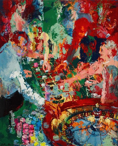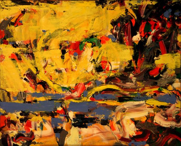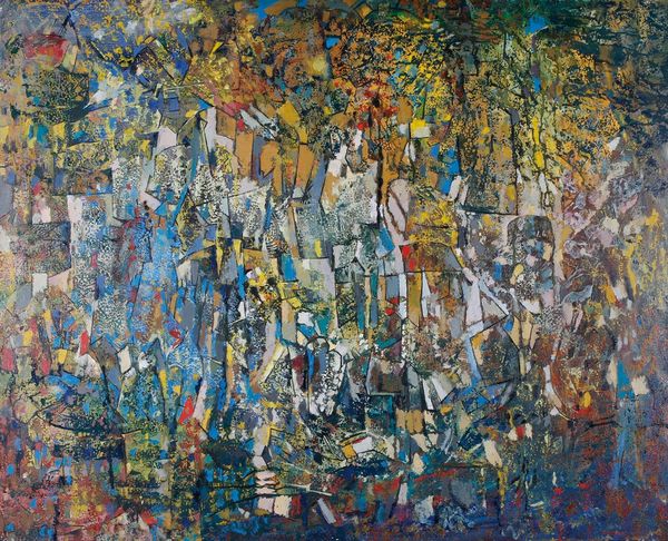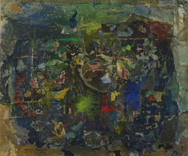 Curator: Right, let's talk about this untitled piece, mixed-media—acrylic paint primarily, it appears—by Ligia Macovei. A wonderful dive into abstraction. Editor: My first thought is just... restless energy. Look at the frenzy of brushstrokes! A sort of dreamscape caught mid-explosion, all swirling earth tones wrestling with cool blues. It almost vibrates. Curator: "Restless" is perfect. Macovei certainly wasn't interested in tranquility here! Speaking materially, I see that thick layering. It is an almost sculptural use of paint to create form without fully committing to form. See the textures, how they push the boundaries between painting and… relief? Editor: It also prompts the question—how much labor, how many layers and trials went into something so ostensibly loose? Each frantic brushstroke becomes almost absurd when you realize the calculation behind appearing so raw. Curator: Absolutely! I imagine Macovei standing back, reassessing, adding, subtracting... you can almost feel her presence hovering over it. While it leans toward abstract expressionism, the fauvist colors do peek through in certain spots—those brilliant oranges really sing against the darker blues, don’t they? Editor: They scream! There is an intentional dissonance there. How far can you push these colors against one another before the whole thing falls apart into garish chaos? And, of course, whose standards are dictating "chaos" to begin with? What were Macovei's source materials? Pigments ground by hand, mass-produced tubes? That informs our interpretation, surely. Curator: Well, regardless, the effect is quite powerful! And given it’s untitled, we can project almost anything onto it—landscape, figures… emotions made visible. You sense this constant pushing, and that refusal to settle is so palpable, so present. Editor: Exactly. And that presence demands we consider the materiality not just of the paints themselves, but of her entire working environment, her lived reality feeding this explosion of energy on the canvas. So much of the process remains stubbornly *there*, clinging to the surface. It refuses to dematerialize into pure aesthetics. Curator: Yes! I find myself drawn into the depth she achieves. Editor: Definitely. This really invites me to appreciate the intense physical processes involved.