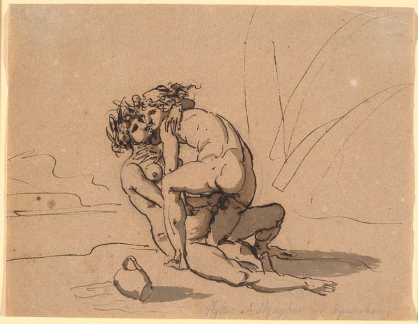 Editor: Here we have Nicolai Abildgaard’s ink drawing, made sometime between 1743 and 1809, titled *A Seated Woman Holding a Mask High Above Her Head*. The piece feels a little unsettling to me. I'm curious, what stands out to you? Curator: It's the materiality of the work that immediately grabs me. Look at the stark contrast between the fluid ink washes defining the figure and the scratchy, almost frantic lines used for the mask and the ground. It speaks to the economics of artmaking, doesn't it? This wasn't a commissioned piece; it’s likely a preparatory sketch, where the value lay in the rapid generation of ideas rather than polished refinement. What do you make of the pen strokes versus the washes of ink? Editor: That's a fascinating point. The ink washes do give the figure a softer, more idealized appearance. I guess the choice of using simple ink reflects its function, whereas if he would've been commissioned for something much larger he may have added much more. Curator: Exactly! And think about the mask itself. It's rendered so crudely, almost violently. It seems that it lacks as much precision and planning compared to other parts of the work. What does the act of 'masking' mean to the artist? Editor: Maybe it suggests the materials available and constraints on Abildgaard’s time or the statement and or maybe it hints that the role that materials may play in shaping identities during that period? The elite, versus everyone else, and what materials were available? Curator: Precisely! The contrast of the carefully crafted body and carelessly handled mask embodies the anxieties of the time: a social structure on the brink of revolution. Do we perform a mask and what does it allow us? Editor: Wow, I never considered the piece that way. It gives the artwork a whole new significance to consider how accessible these resources were depending on who commissioned or made it. Curator: Absolutely! Thinking about the production and what surrounds it completely changes the work’s intent.