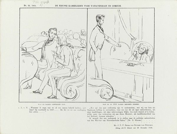Editor: This is an ink drawing from 1864 by Johan Michael Schmidt Crans. The title is quite a mouthful: "Spotprent op de interpellatie van Rochussen over het omhakken van koffiebomen in Indie." I'm struck by its somewhat whimsical and satirical tone. What do you make of it? Curator: Given the title, and knowing the historical context, it's likely a piece of political commentary. The "interpellatie," or questioning, of Rochussen probably refers to a parliamentary debate about the destruction of coffee plants in the Dutch East Indies. How do you think this debate manifests in the imagery of the cartoon? Editor: Well, there's a central figure blowing on a cup, presumably coffee. And the caption reads something like "Hard blow and mouth burned"? So there’s something ironic about the coffee causing harm despite the attempts to cool it down. Curator: Precisely! The artist likely used this imagery to critique Dutch colonial policies. The "burning" suggests that even seemingly beneficial policies were causing pain or harm to the colonized population. Considering this, where do you think the figures lurking on the left are placed? Editor: They seem like shadowy observers, removed from the central action with the coffee, maybe suggesting detached members of the parliament? It definitely deepens the political meaning knowing that coffee is connected to the coffee plantations. Curator: Exactly! And seeing the sketchiness of the art form in terms of its political context gives it another layer of meaning as propaganda. What began as funny or sarcastic now gives a look at political relationships from that time period. Editor: I had missed that at first glance but now I see it's a snapshot of the politics of the coffee trade at the time. It really highlights how even a seemingly simple drawing can reveal complex political realities. Curator: It does, and that's the power of art—revealing how museums, galleries, and socio-political forces all interact in different public and private displays.
